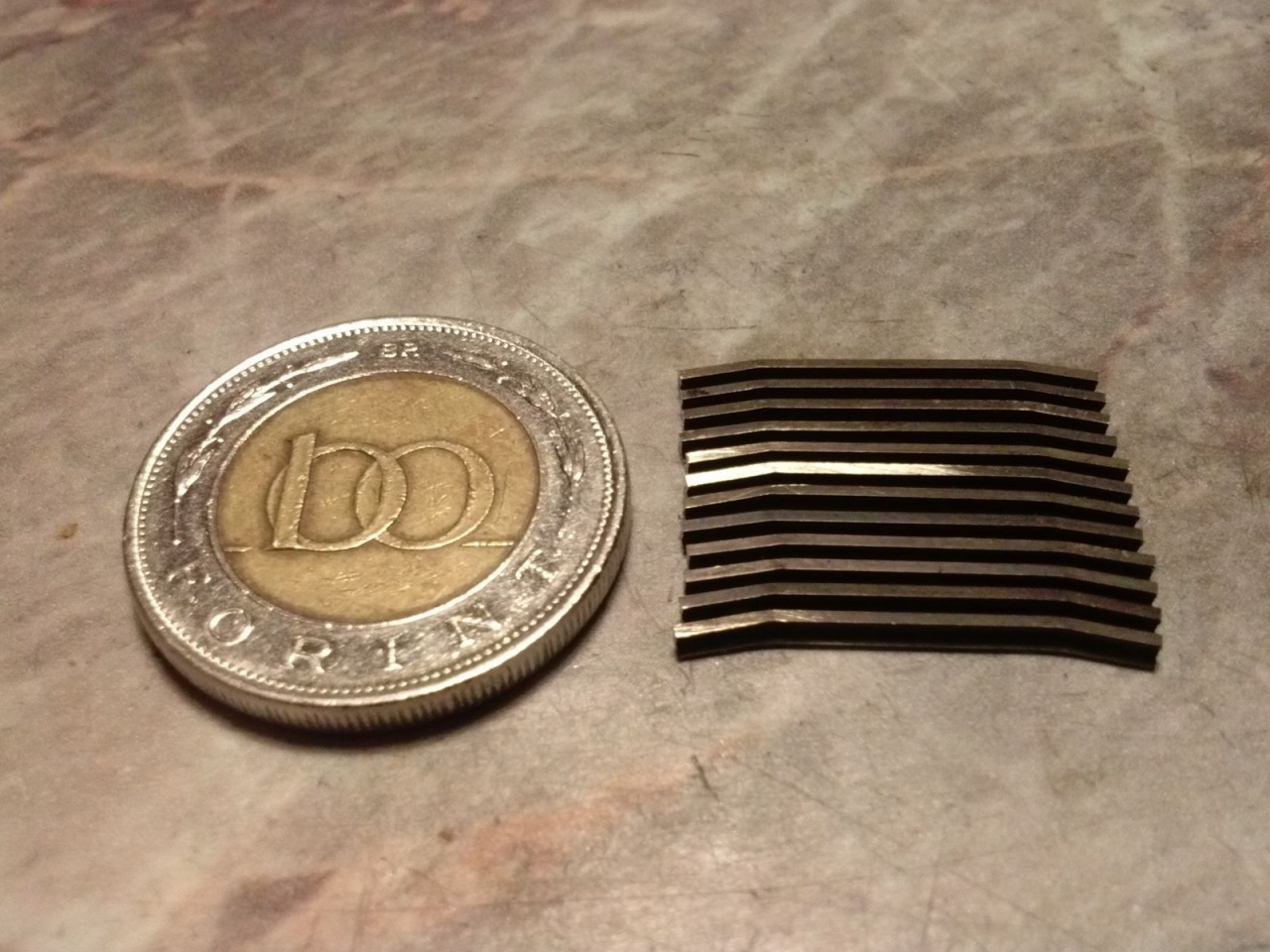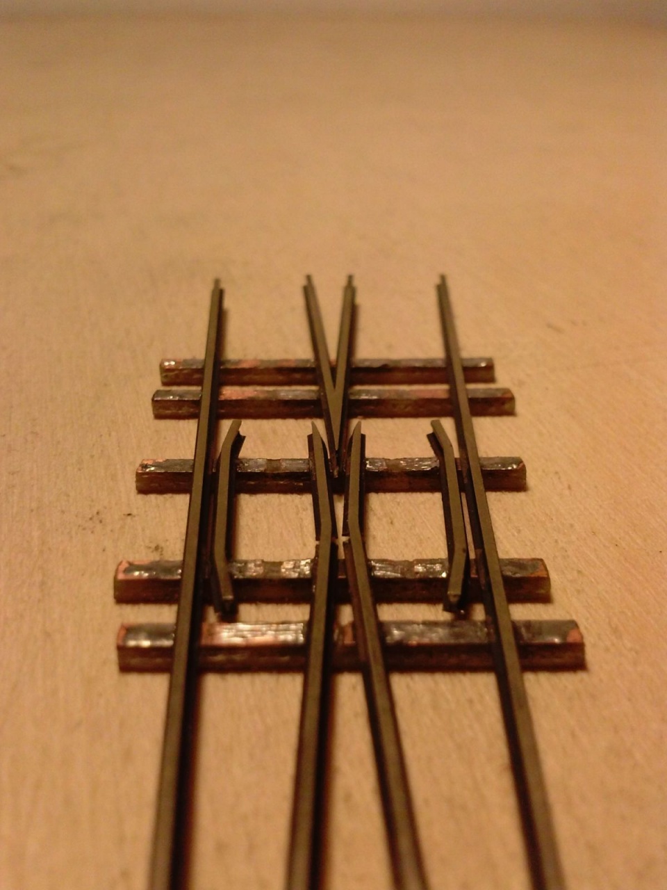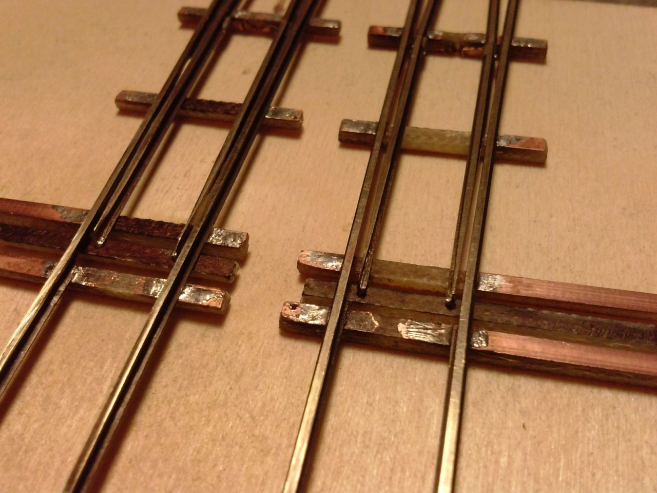 Ma befejeztem a H0e váltók vázait. Itt a csúcssínek illesztése sem egyszerű, mert olyan alacsony a profil, hogy nem tudok az oldalára forrasztani (ráadásul barnított). A csúcssínek első csapját a csúcssín anyagából alakítottam ki. Az állítást egy keresztbe fordított 1mm vastag nyáklemezzel oldottam meg, amit bereszeltem a megfelelő helyeken, majd a hornyok fölé réz lemezkét forrasztottam. Ez azért is jó, mert így az állító talpfa jóval vékonyabb a többinél (A valóságban ez ugye csak egy rudazat). |