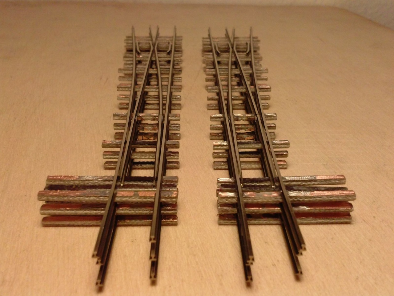 Nos, erős csúszással, de a H0e váltók szerkezetei is elkészültek. Ennél a cuccnál gondot okozott a csúcssínek mozgatása, mert nem akartam a barnítást megsérteni, így a csúcssín elejéből alakítottam ki a csapot. Később rájöttem, hogy akármilyen óvatosan dolgozok, akkor is megsérül. Ráadásul az állító talpfával is bénáztam egy sort, így az egyik darab elejét addig hajlítgattam, amíg eltörött. Ez a sín talpából kivágott anyagból pótoltam, így még a CODE 55 sín ellenére is elég vékony maradt, hogy ne akadjon benne a nyomkarima. |