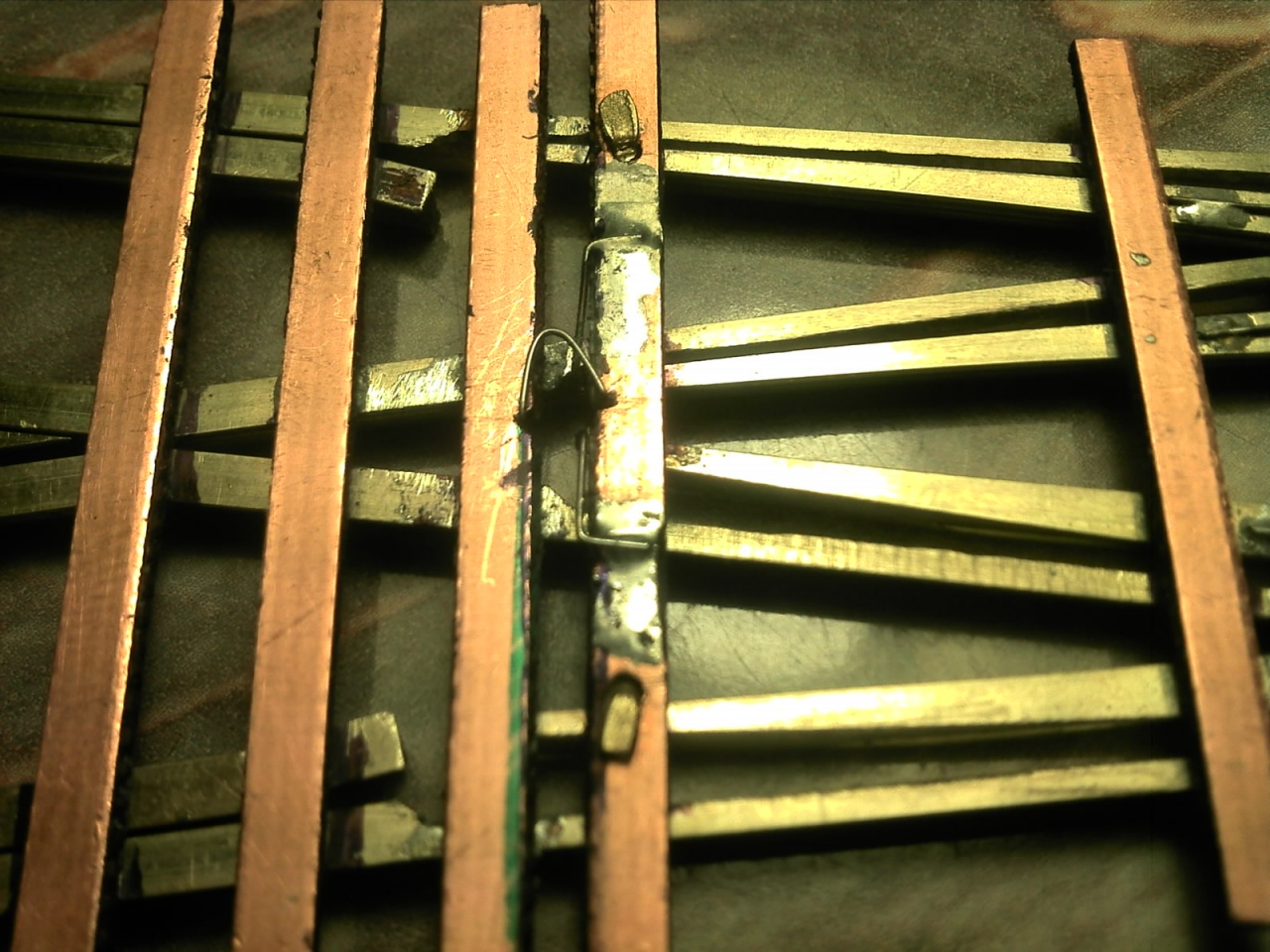 A másik, hogy a gyökcsapos csúcssíneket rögzíteni kell. Régebben azt is acélszállal oldottam meg, ahogy a képen van, manapság már egy vékony rugóbronz csíkot forrasztok a sín oldalára a hajlás szerinti belső oldalra, úgy, hogy csak a két végét forrasztom oda, és a csík legalább 10mm hosszú. Ezek, azon kívül, hogy helyén tartják a csúcssínt, még a tökéletes áramellátásról is gondoskodnak. |