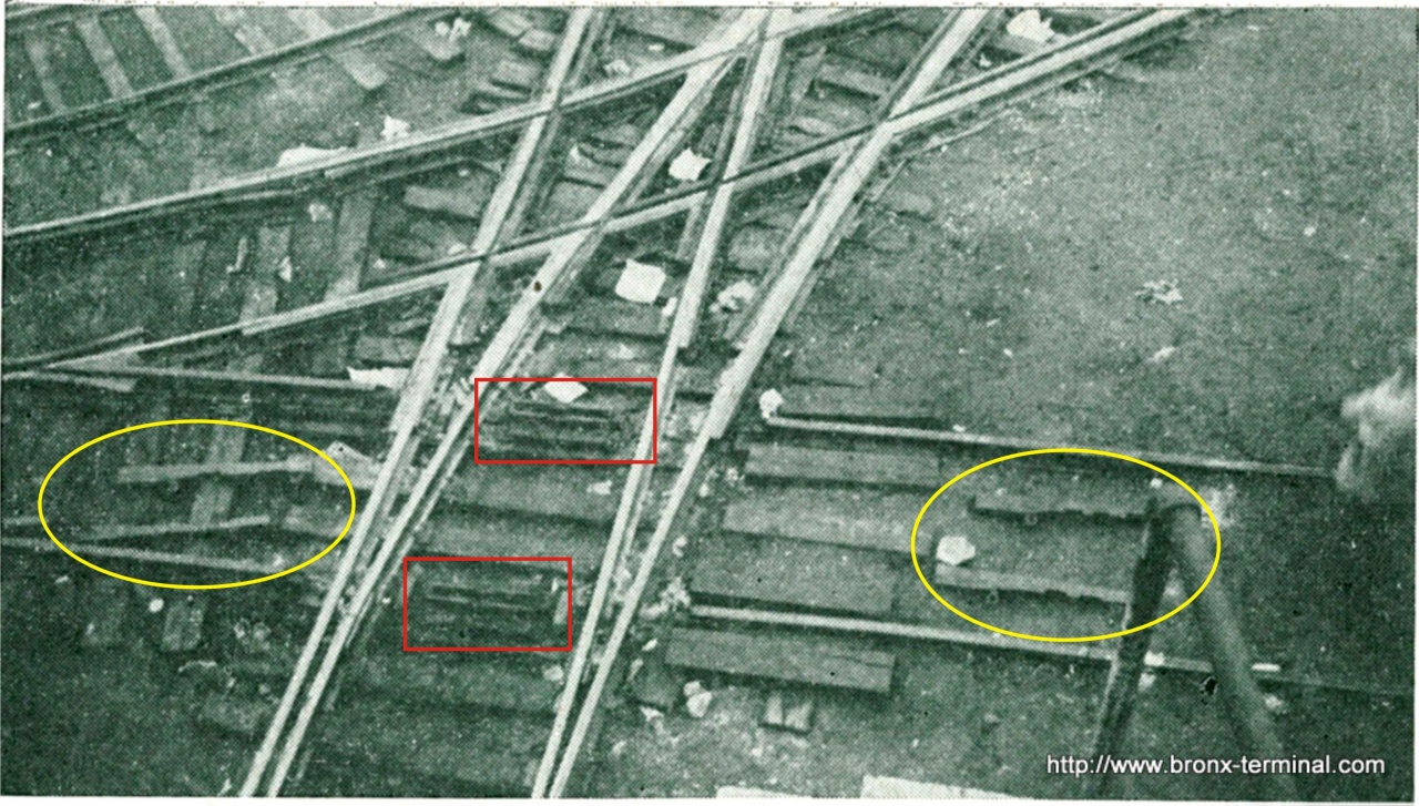 A sárgával bekarikázott négy síndarabot ráillesztették a sínvégekre, ill. a pirossal jelzett fészkekbe, és kvázi a keresztezett sínek fölött gurult át a mozdony a mozdonyszínbe.