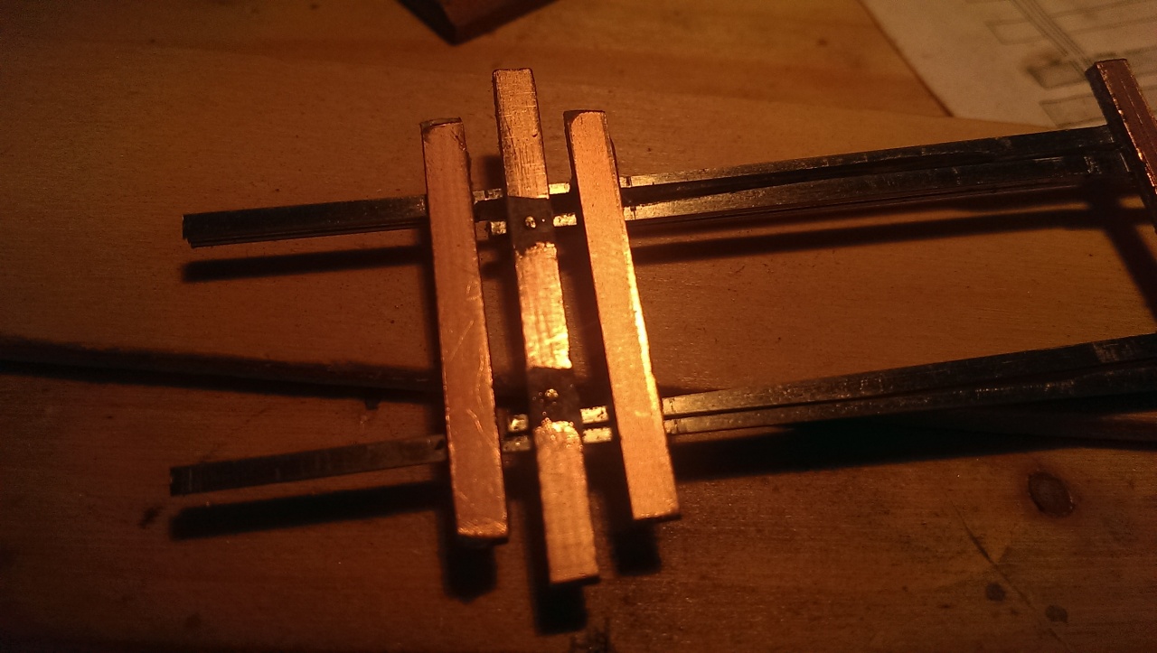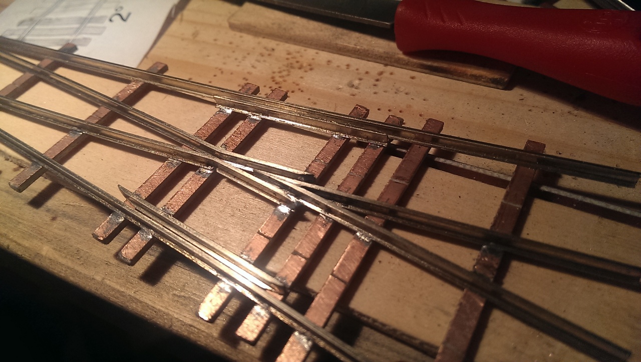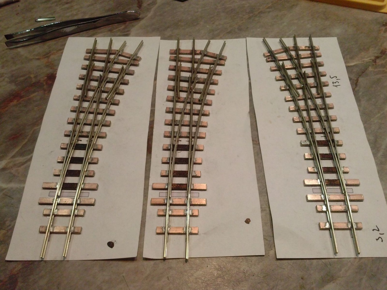 Úgy nézem szépen megcsináltad a csapos feladatot.Az angol csak annyival nehezebb, hogy sokkal több mindent kell pontosan csinálni. Különösen a középrésznél minden távolság betartandó.Én az itteni képek alapján építettem egy saját geometriájút.Annyit változtatam, mivel úgyis szervóval lesz állítva, a középső csúcssíneket nem csaposra készítettem , hanem lereszeltem az oldalukat,és fixre forasztottam a közepénél. Így rugalmasan nekinyomódnak a középső tősínekhez. Állításnál nem a csúcssínt nyomon a tősínhez, mert így nehéz volt beállítani hézagokat, hanem a másik oldali csúcssínt húzza el a tősíntől az állító rúdba reszelt horony.