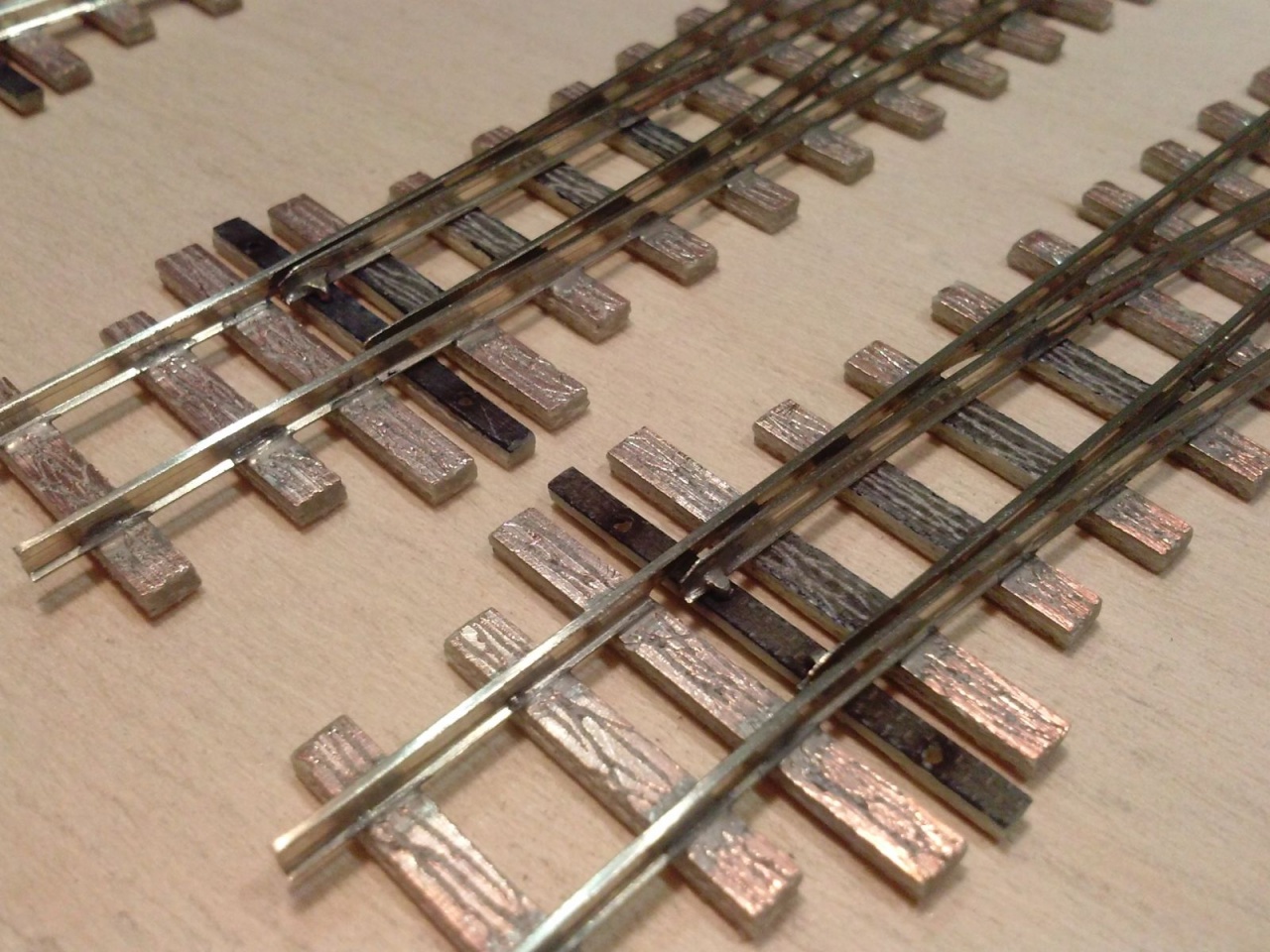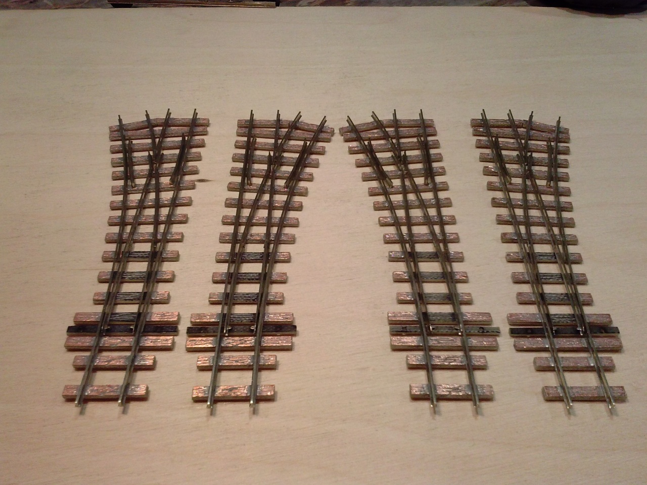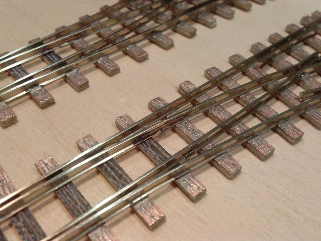 Úgy nézem szépen megcsináltad a csapos feladatot.Az angol csak annyival nehezebb, hogy sokkal több mindent kell pontosan csinálni. Különösen a középrésznél minden távolság betartandó.Én az itteni képek alapján építettem egy saját geometriájút.Annyit változtatam, mivel úgyis szervóval lesz állítva, a középső csúcssíneket nem csaposra készítettem , hanem lereszeltem az oldalukat,és fixre forasztottam a közepénél. Így rugalmasan nekinyomódnak a középső tősínekhez. Állításnál nem a csúcssínt nyomon a tősínhez, mert így nehéz volt beállítani hézagokat, hanem a másik oldali csúcssínt húzza el a tősíntől az állító rúdba reszelt horony.