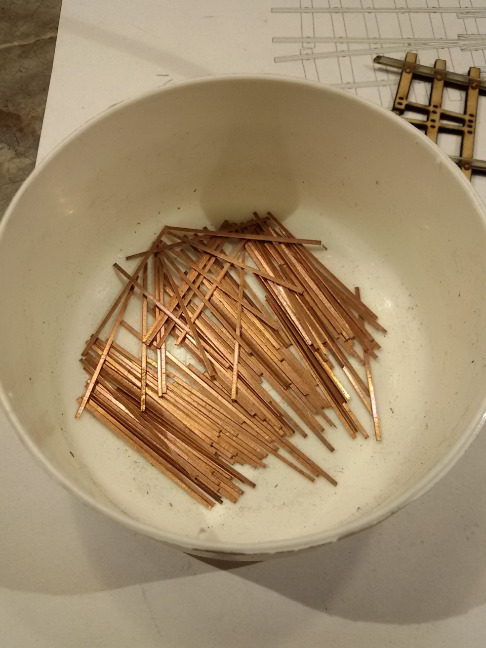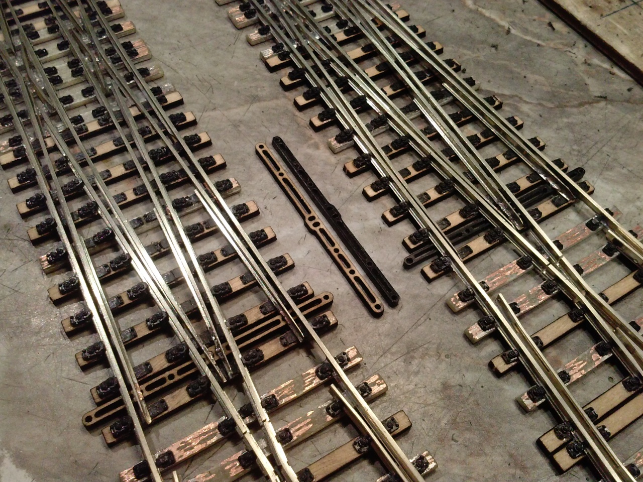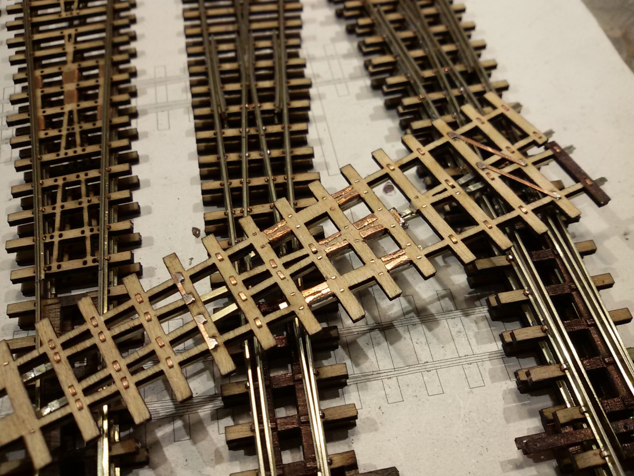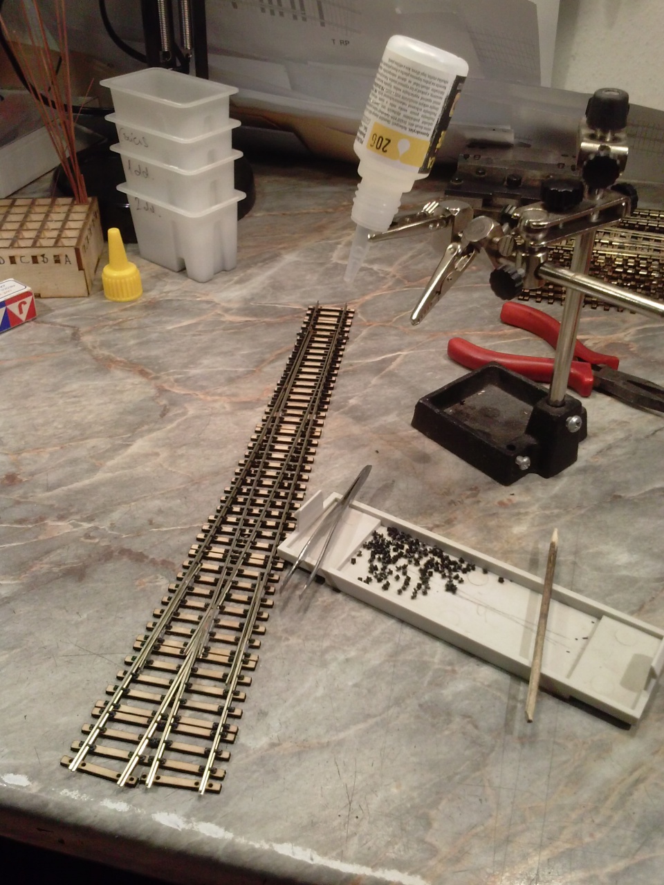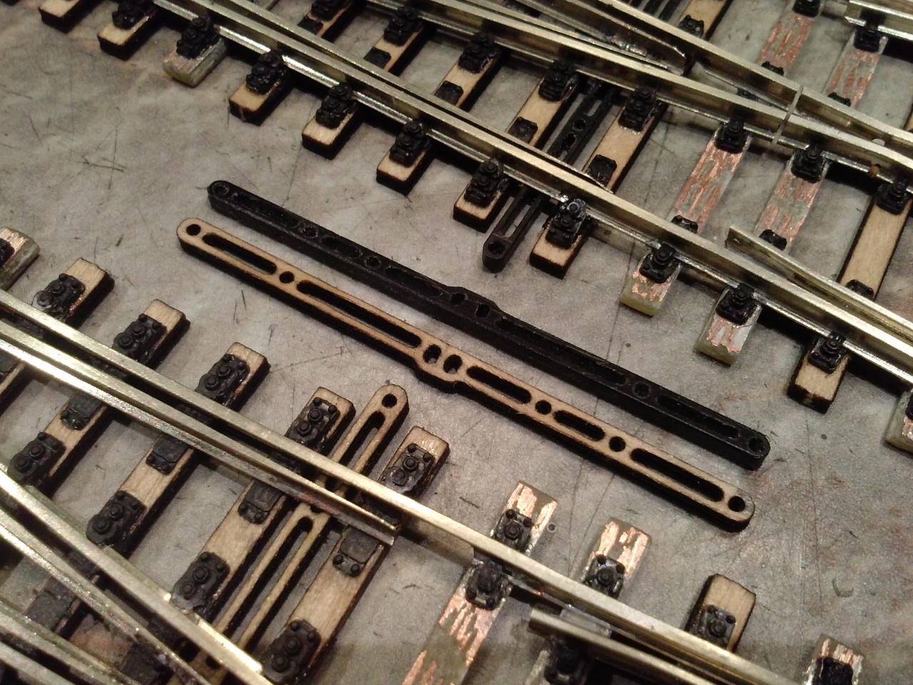 Befestettem az első példányt a tűzőgépkapcsos H0e váltóból, és elkezdtem építeni 11 hasonlót de ezeket CODE 70 és 80-as profilokból. A tűzőgépkapocs nem vált be igazán, úgyhogy 0,3x0,8mm-es réz csíkokból hajlítottam hozzá kapcsokat. |