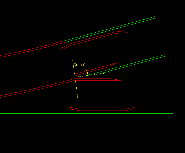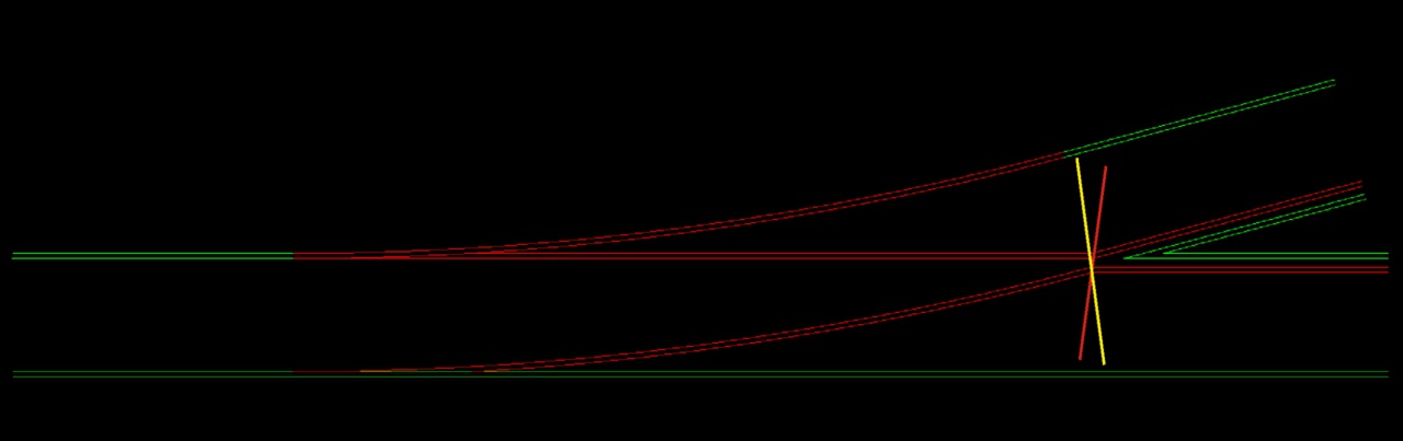 Első körön annyi hibát látok, hogy a könyöksínek hajlása nem jó, annak egy balra 7,5 fokos (352,5 fok) egyenes mentén kéne lenni, ha a keresztezési csúcs 15 fokos. A te terveden ezt a két pontot pont egy ellentétes irányba dőlő egyenessel tudod összekötni. A másik, hogy hiányoznak a vezetősínek a keresztezés két oldaláról. A piros vonal mutatja a jelenlegi elrendezést, a sárga pedig ahogy lenni kéne. |