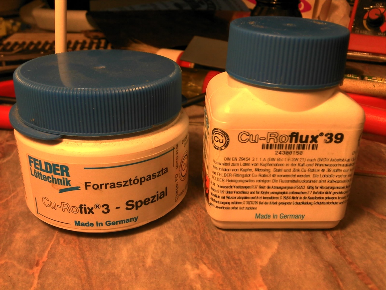 Én ezeket használom. A paszta ón tartalmú, vízszerelési boltban kapható pár száz forintért, a másik egy ezres volt, valahol a neten rendeltem, és egy sűrű átlátszó folyadék.