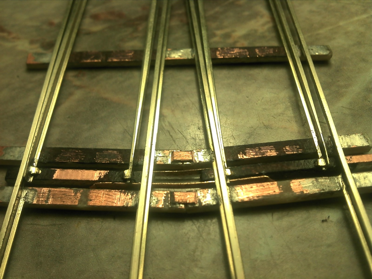 Nagy problémám volt, hogy miként fogom állítani ezt a bázelit. Először arra gondoltam, hogy az utolsó két egyenes talpfa között lesz az állító "rudazat", mint ahogy a ROCO 15°-os bázelijénél van, de nem igazán tetszett. Ha már a valóságosra hasonlító kitérőt építek, akkor az állítása is hasonlítson, amennyire csak lehetséges. Így mégis a csúcssín végénél állítottam, és a két talpfát 0,15mm-es rugóbronz lemezzel kötöttem össze. |