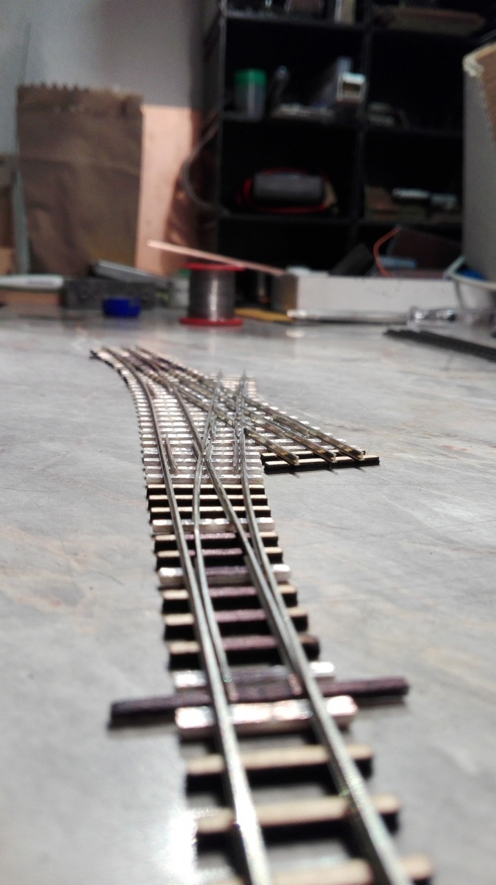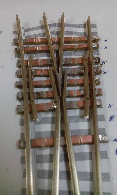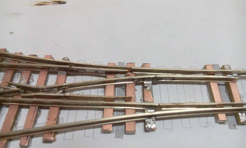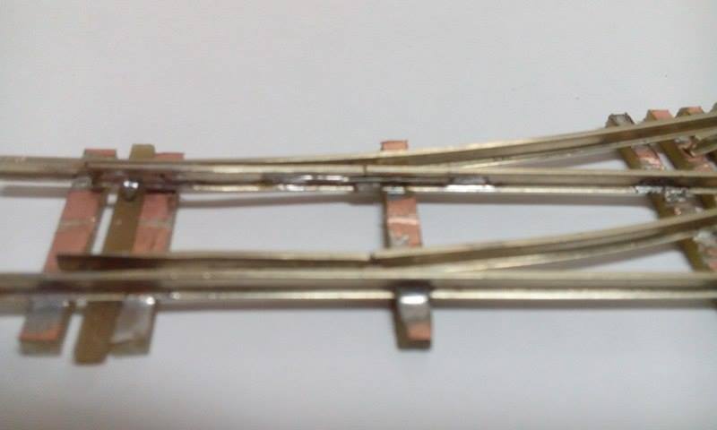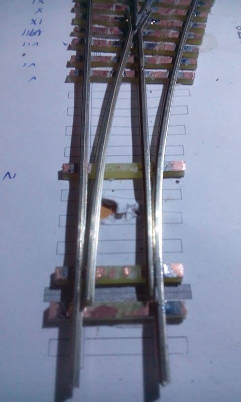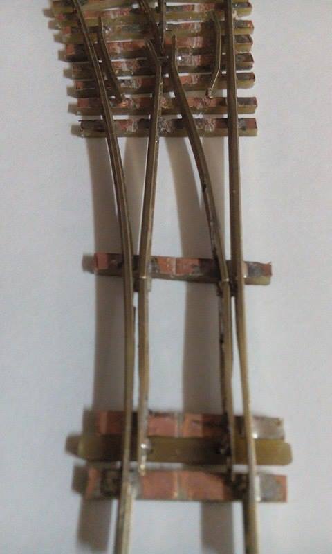 A vezetősínek még készítés alatt álltak amikor a képek készültek  a szigetelő vágások is elkészültek már , és megcsináltam a síntalpak kikönnyítését is ( így tényleg sokkal könnyebben állítható a váltó ).