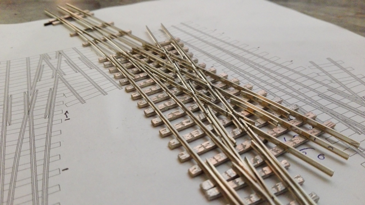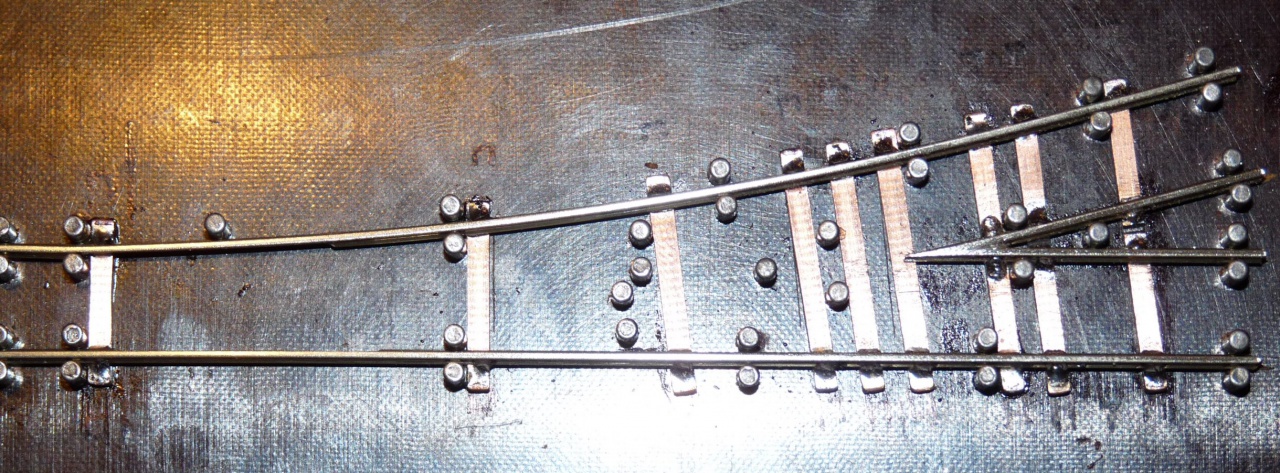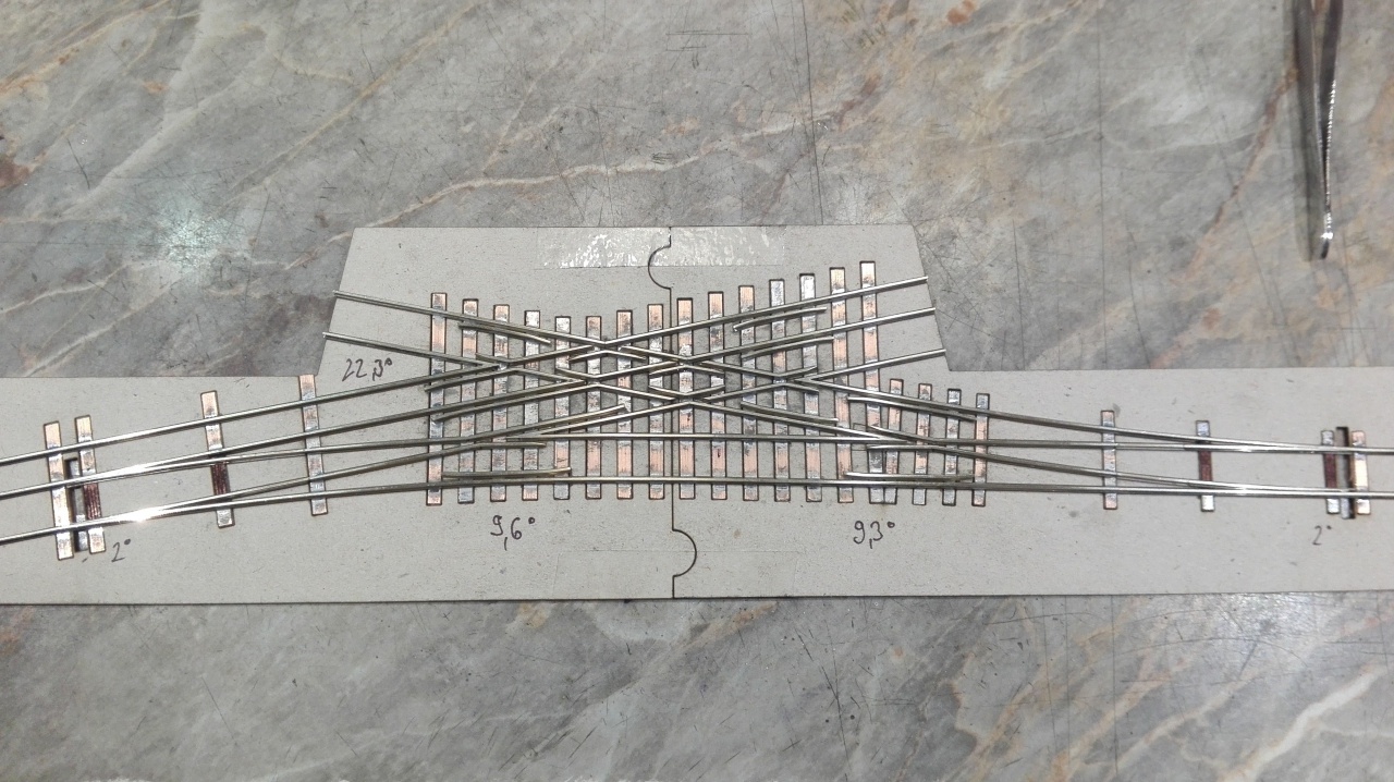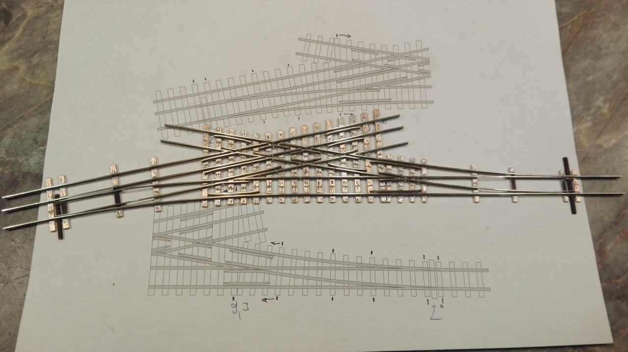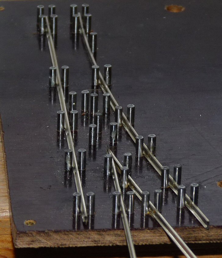 Én is felteszek pár képet a készülő váltóimról. A képeken látszik, hogy én milyen sablont használok. Textilbakelit lapba vannak 2mm-es csapágygörgők belefúrva, így gyerekjáték a nyomtáv és geometria helyes tartása. Én is feltennék egy kérdést az angolos képemmel kapcsolatban. Hogyan tudnám kicsit növelni a két belső csúcssín közötti távolságot? Egyébként N méretarányban építek.