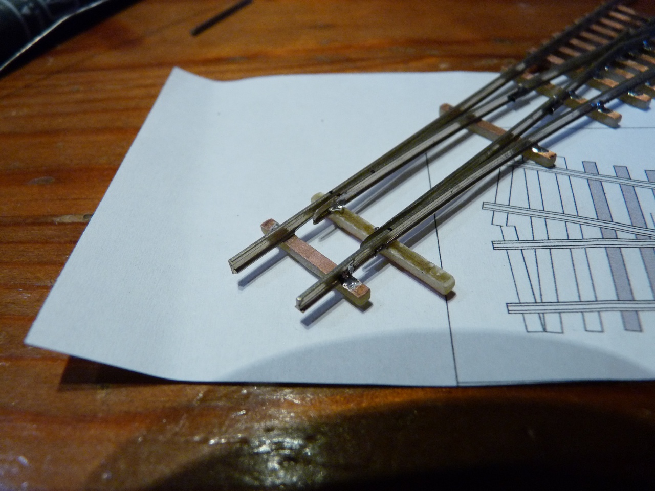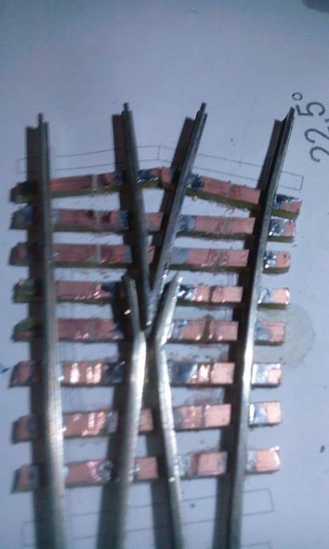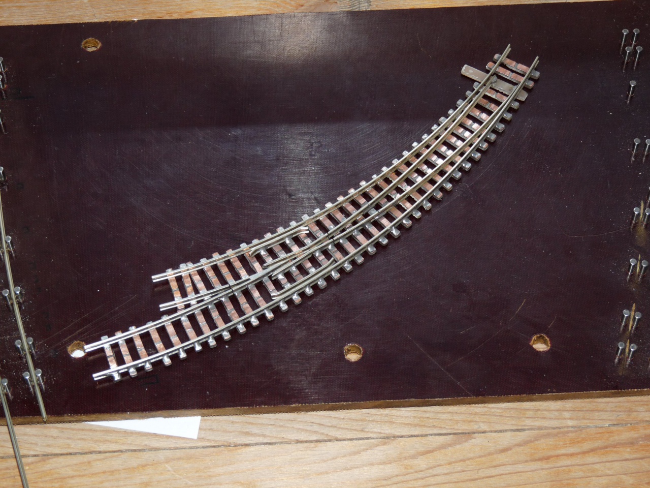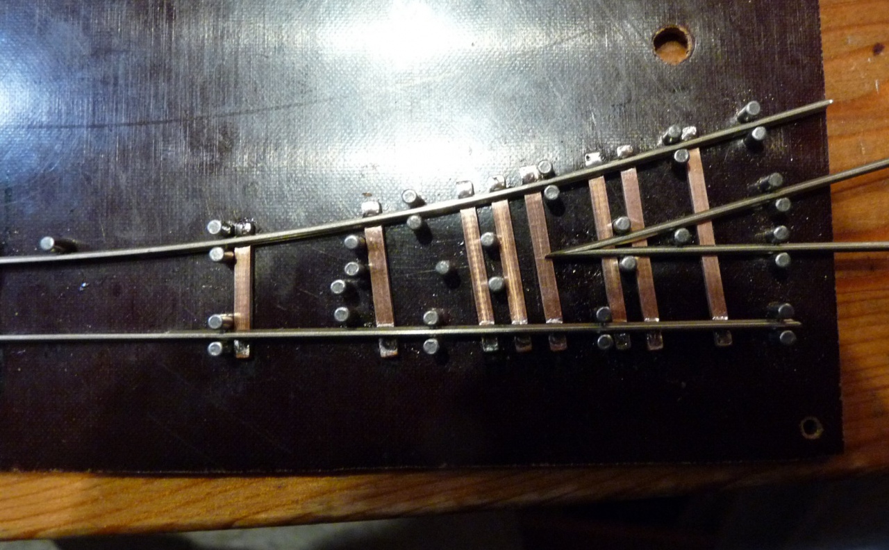 Én is felteszek pár képet a készülő váltóimról. A képeken látszik, hogy én milyen sablont használok. Textilbakelit lapba vannak 2mm-es csapágygörgők belefúrva, így gyerekjáték a nyomtáv és geometria helyes tartása. Én is feltennék egy kérdést az angolos képemmel kapcsolatban. Hogyan tudnám kicsit növelni a két belső csúcssín közötti távolságot? Egyébként N méretarányban építek.