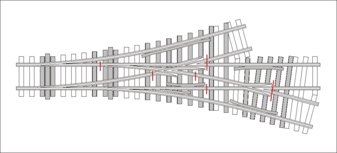 A trükk abban rejlik, hogy a keresztező vágánytengelyek nem zárhatnak be derékszöget, így az valamelyik oldali kerék (elvileg) folyamatosan meg van vezetve. |