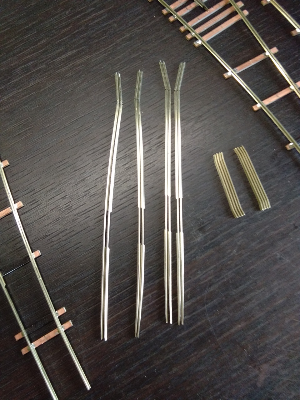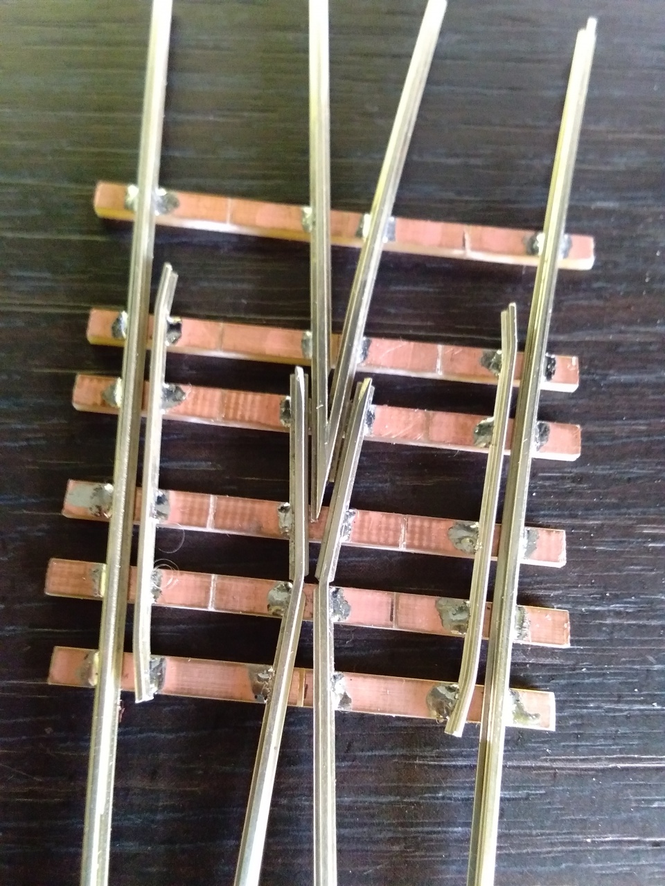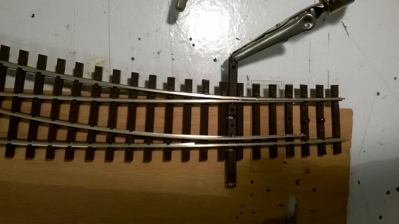 Igen, Tillig-Pilz 2,5-es sínből levágok akkorát, ami a szívtől egészen a tősínekig ér. A végét megcsiszolom, éééés. jön a legnehezebb rész: a félig elcsiszolt amúgy is vékony sín aljára kell forrasztani egy kis pöcköt, amit tud mozgatni a váltóállító lapka ide/oda.
