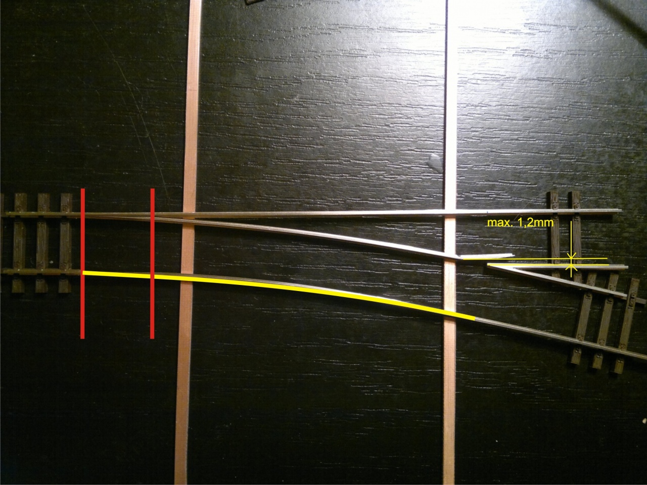 2. A kitérő oldali tősínt a kikönnyítésnél egy minimális szögben meg kell hajlítani (mint a videóban), hogy a csúcssín szépen, hosszan fel tudjon feküdni, lévén ívben elég nehéz reszelni, ennyit csalni kell az üzembiztonság érdekében. A piros vonalak közötti rész tk. egyenes legyen.