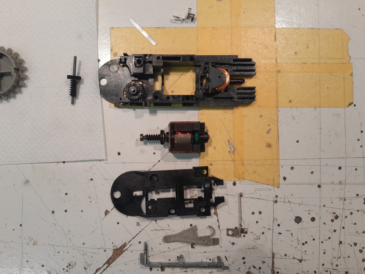 Nézegettem, szétszedtem, a motor tökéletesen forog mindkét irányba. Összeszerelve is elindul mindkèt irányba, de a balra forduláskor szinte azonnal megáll a motor. Sok piszmogás meg fejtörés után kiderült, hogy a motoron nemcsak egy csiga van hanem egy kuplungos fekete izé is , ami egy vonalzo mozgására hivatott rásegiteni. Ráadásul a vonalzó egy cinköntvény. Nem tudom megitélni, hogy vetemedett-e vagy sem. A turpisság a dologban, hogy a csiga azzal a fekete alkatrésszel egy mechanikus egyenirányitó szerepét is eljátsza, mert máshol van az egyik irányban meg máshol a másikban.