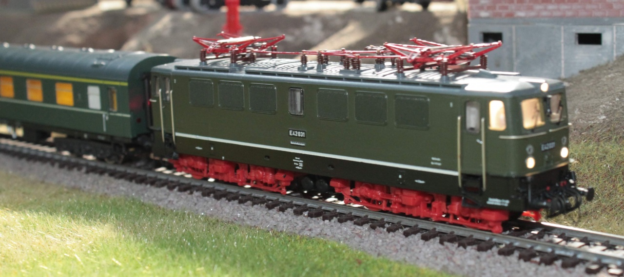 Régi E42 kasztni, forgóváz, új roco hajtás, lecserélt küllős piros kerekekkel.