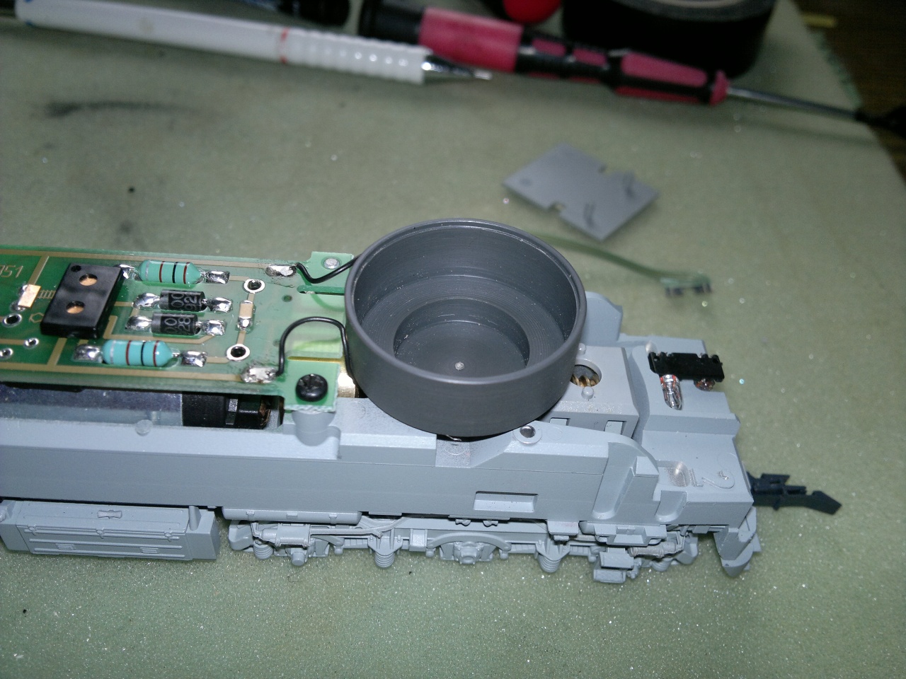 - nem feltétlen szükséges két ménkű nagy elkót használni a LED világítás szűrésére, így itt is lehet helyet nyerni. A műhelyben hangosra épült M41-kben a komplett saját átszerelő készletemmel dolgozik együtt a Tran dekóder. A súlyba besűlyesztett helyre kerül a dekóder, a másik oldalra pedig a hangszóró. Marni, reszelni nem kell. Amúgy sem szerencsés a modell tömegét csökkenteni. 15*11*8mm.
