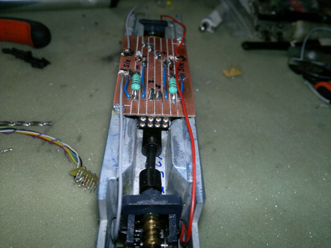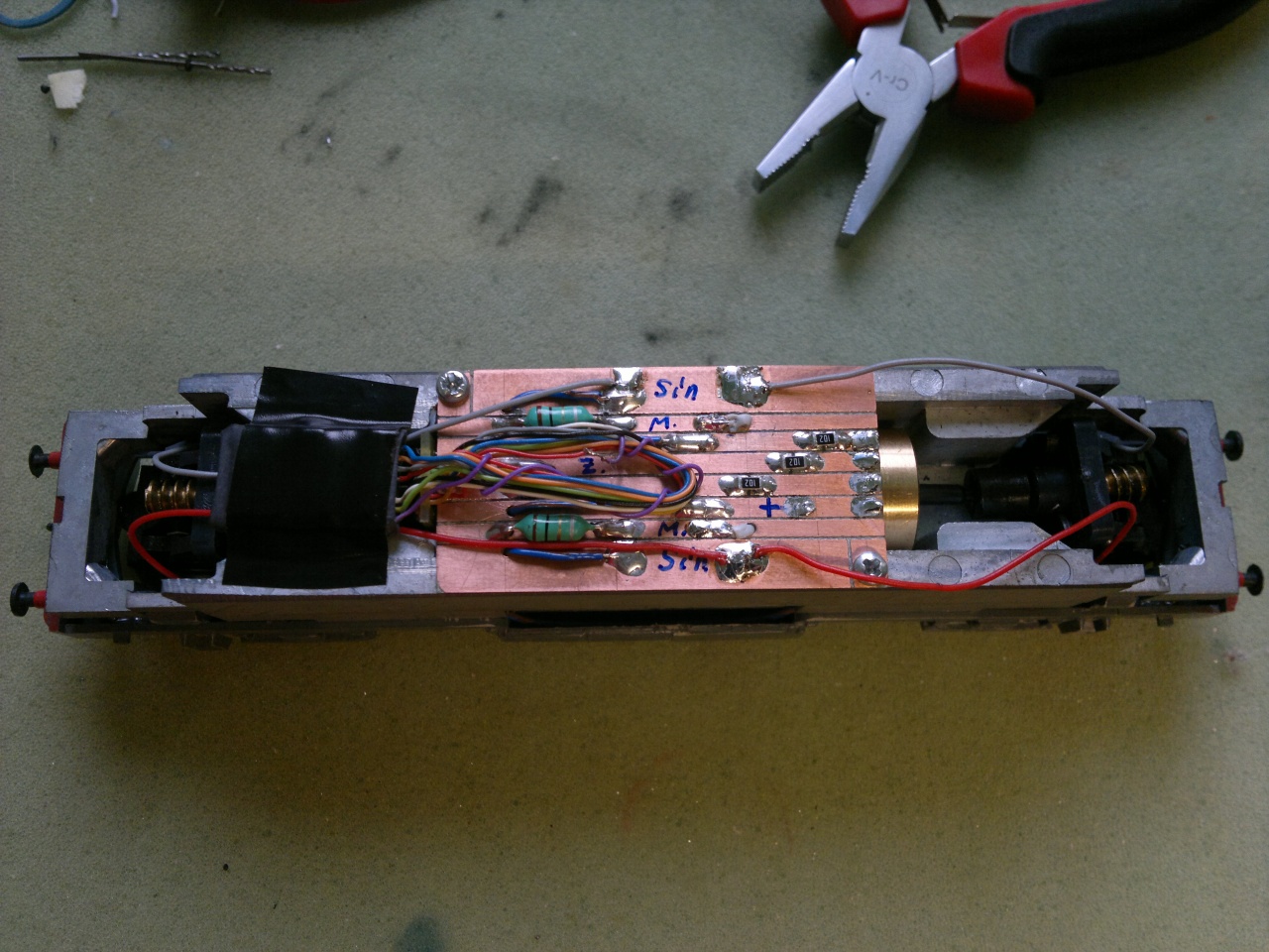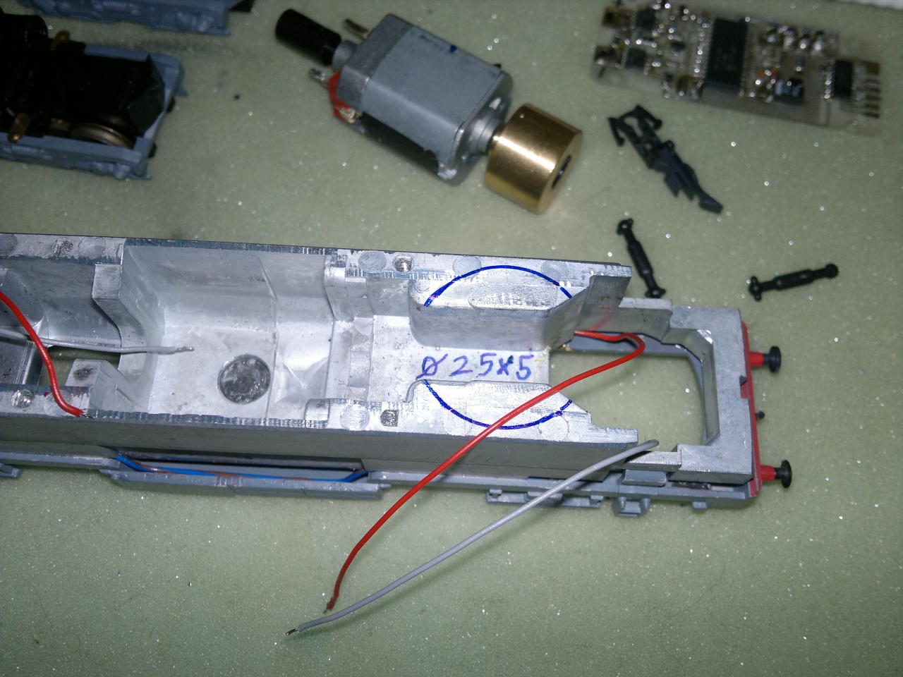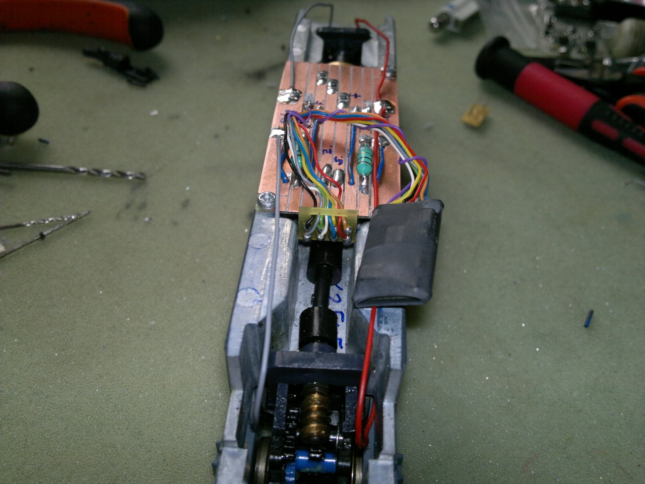 Ez itt kerül összeszerelésre a műhelyben, a festett kaszni, meg a váz Fuggerth-től jön, a forgóvázak is, csak ki van kötve, hogy nekem ki rakja össze, az elektronikát azt én gyártom bele, a dekódere PLUX12-es Tran (DCX51-P12), a rézmaratott csecse-becséket meg jakoa barátom készíti. Csendben van, nem reszel, nem darál, nem ugrál a síneken, nyugodtan oda lehet tenni egy neves modellgyár terméke mellé. Ezt el lehet követni a régebbi Fugghert M41-kel is, csak anyagtól függően 4-7.000Ft a munkadíj.