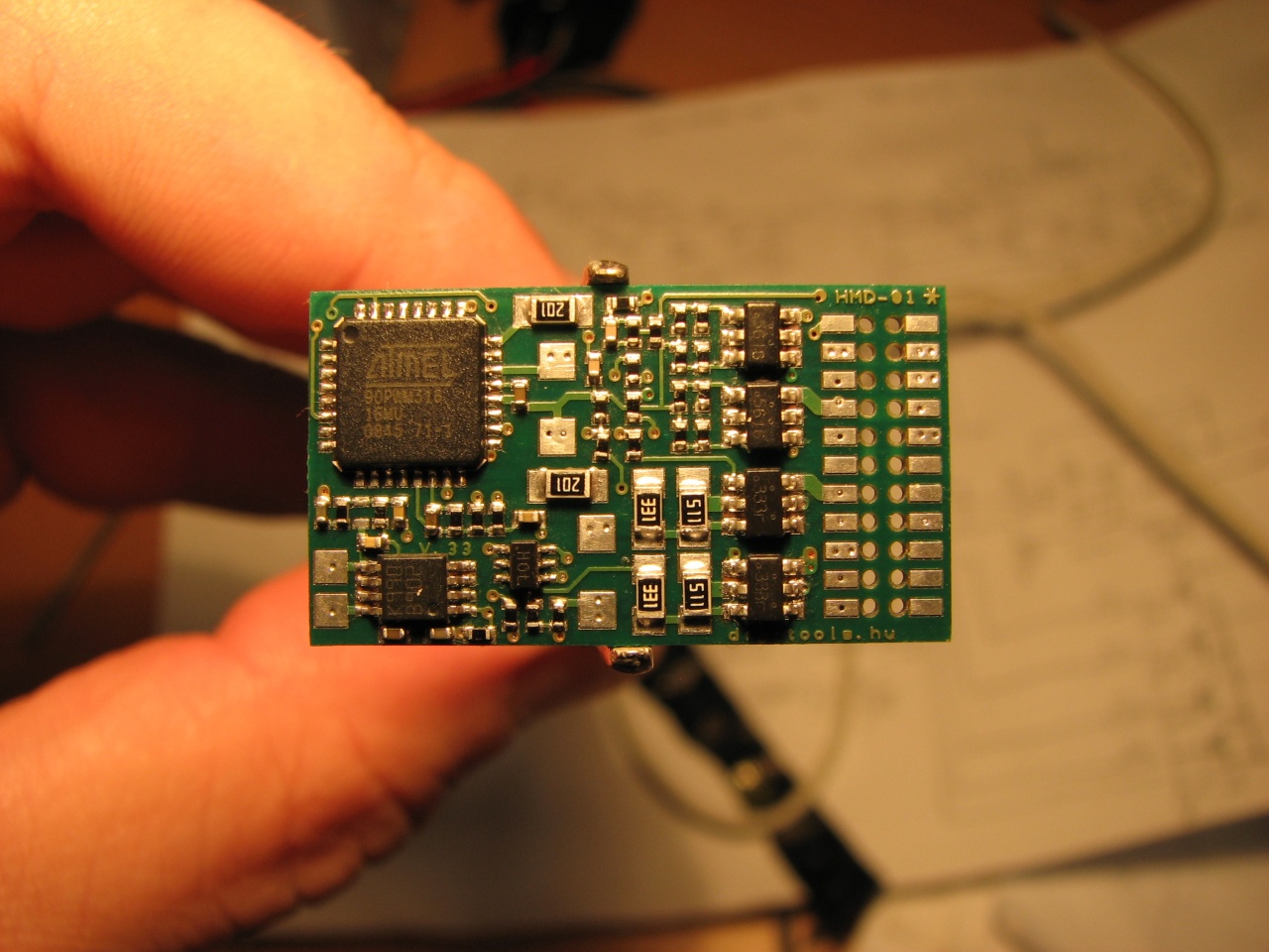Azért az első változata nem ilyen volt ám! Azt idehaza én fotóztam Positiv20-szal, illetve nem is ezzel, hanem a Wolf fotólakkal. Csak egy bizonyos darabszám felett már inkább elküldöm a .gbr fájlokat a NYÁK-üzemnek.  Egyébként, ha valaki könnyen és gyorsan szeretne áramköröket tervezni, az keressen rá a "Sprint layout5" szavakra. |