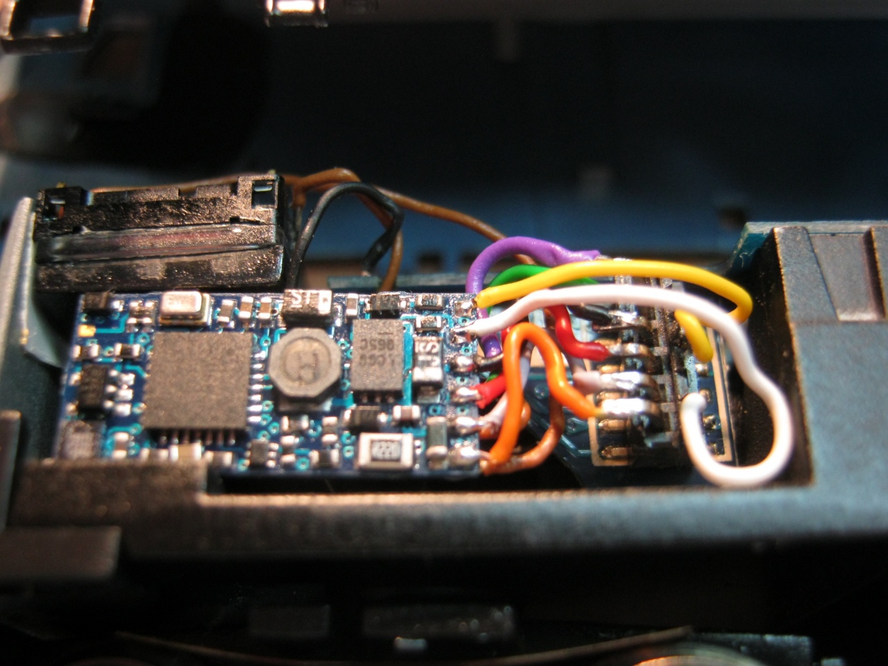 Gőzösök kazánfénye: van olyan modell, amiben eleve van ilyesmi (Liliput BR42, BR52, BR62), abban csak be kell kötni a megfelelő funkcióra az izzót. Ez Tran-nál én az F2-re kapcsolom (lila vezeték), és a dimmerelést, meg az effektusokat is ennek megfelelőre programozom be. Csináltam már pár másik modellhez is, történetesen ez a BR78 nem kapott ilyet, de ennek oka van. A régi, dobmotoros Fleischmann váz nem igazán erre van kitalálva (füstre sem). |