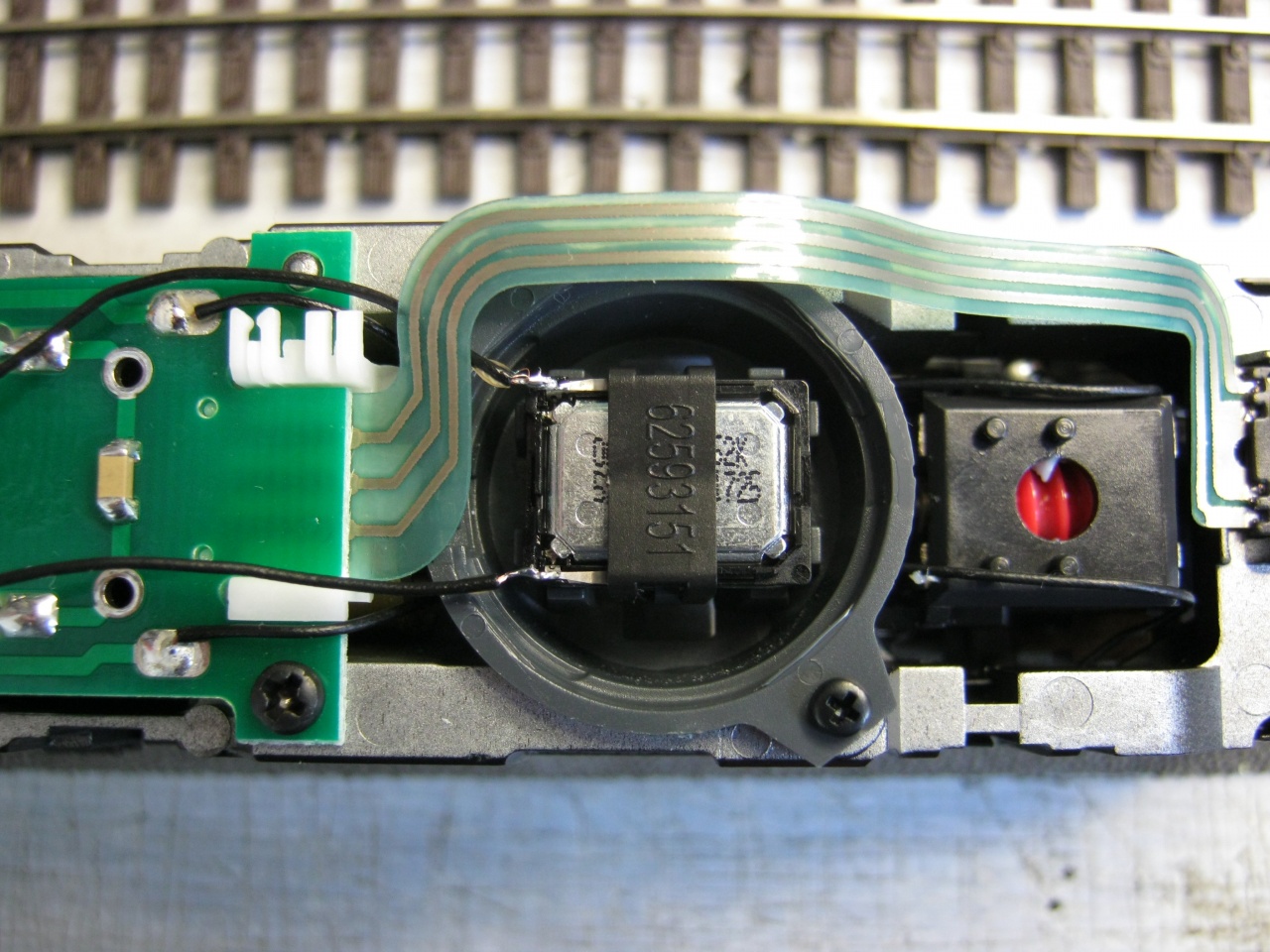 Képen a ROCO új, ZIMO dekóderes M61-ese. Látható, hogy a kocka hangszórót egy műanyag pánt szorítja le az átalakított rezonancia dobozra. Ugyanis megtartották a mozdony vázához való műanyag betétet, ami az ESU 100Ohm-os hangszóróhoz volt, de belül ez át van alakítva, a kis kocka már egyben van a kerek műanyag házzal. Erre a kocka "betétre" van a kétoldalas, szivacs szerű, légmentes ragasztóval rögzítve maga a hangszóró. Mivel ez tartósan, és eléggé jól is ragad, így a képen látható műanyag pánt teljesen felesleges van ott, csak gátolja a hangot. Kicsit túlbiztosították a dolgot...