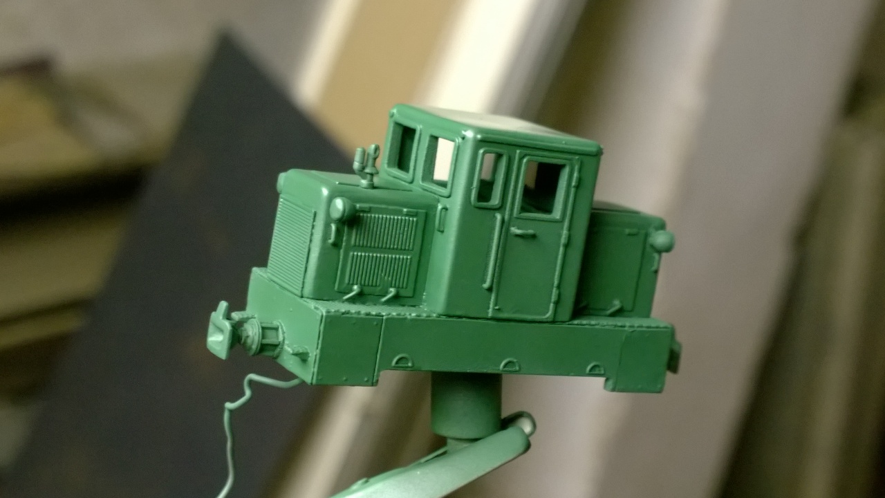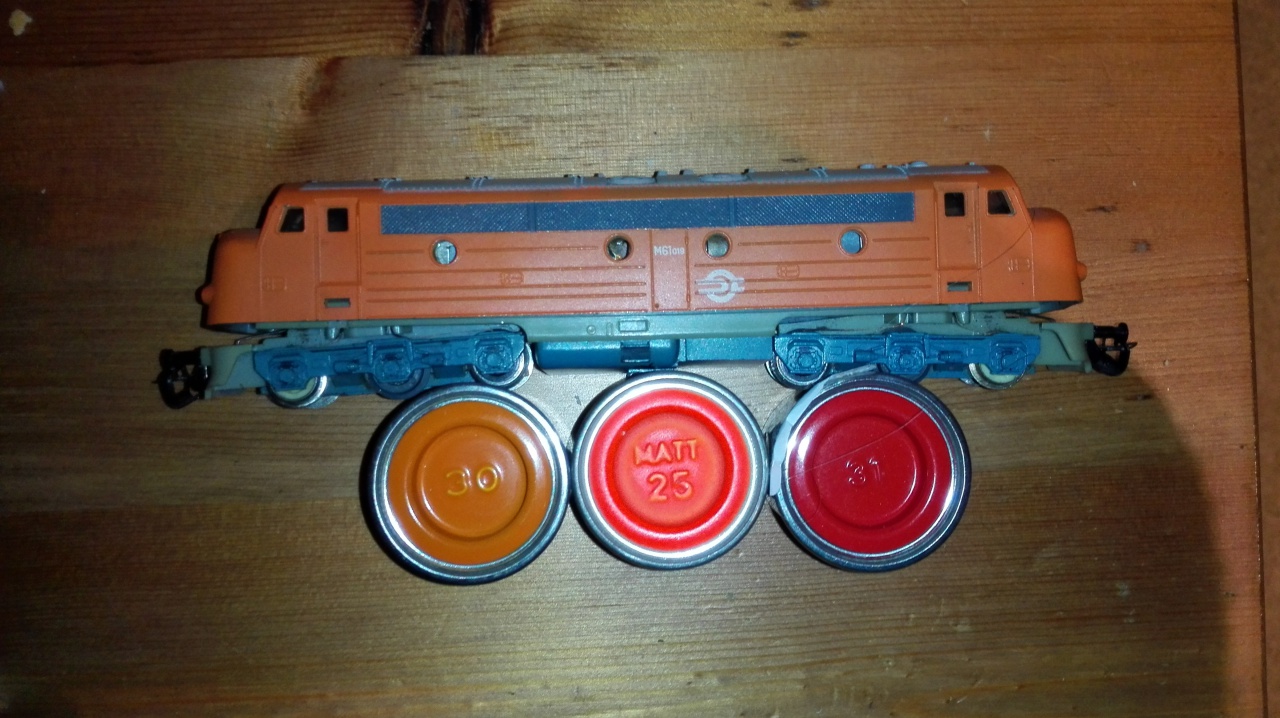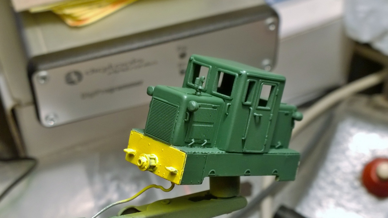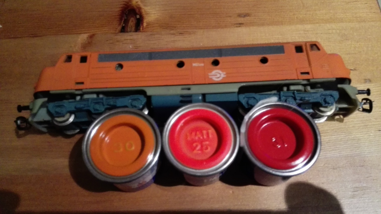 Azóta már kiderült,hogy alapozás után az alvázkeret frontjaival kellett volna nyitni,sárga alappal,utána következeik az oldalsó pirosok festése,ezek után jött volna rá a fekete csíkozás + a járdák feketéje kitakarva és csak a legvégén kellett volna a mozdonysátor zöldjét fújni.