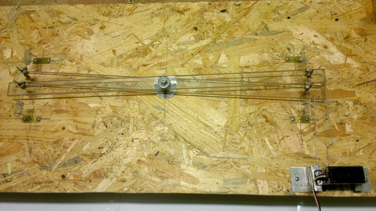 A mozgatást meg egyszerűbb lenne megoldani szervóval,akkor a két kar mozgatását egyszerre tudnád elintézni(csillaggal vagy körtárcsával,két mozgatóhuzallal),nem kellene az a csuklópontos mechanika.