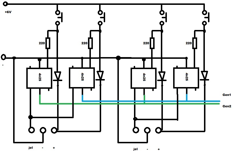 És van egy opto kapus panel aminek 2 szervó kimenete van (illetve párhuzamosan még 2) ennek a + bemenetére amikor áram megy akkor az annak megfelelő opto nyit és ráereszti valamelyik generátor jel kimenetét. Persze nem 4 nyomógomb van, hanem diódákkal összefűztem 3 kombinációba az állomásom vágányútjainak megfelelően. Kb ennyi...