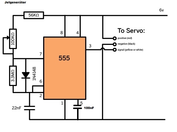 Ki lehet rakni optocsatolók nélkül is, persze a fő probléma megmarad, nevezetesen, ha az 555 kapuzva van, előfordulhat, hogy az utolsó impulzus szélessége kisebb a normálisnál, ezért szervo nem a megfelelő helyre áll be. Ezt ugyan kiküszöböli a szervo tápfesz. kapcsolása, de mivel diódákon keresztül megy a 600mA , azok egyenkén is legalább 1-1,2V-ot levesznek a tápból,3V alatt a szervo megbolondul. Ezért kellett 6V tápra felmenned.
