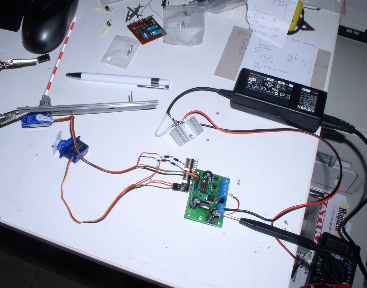 Tudom, hogy a szervóvezérlés eléggé zsákutcába futott most, de én tovább kísérleteztem a "hol legyen az elektronika" témában. Ugye tehető a pultba és akkor minden szervó kap tápot (akár egymástól párhuzamosan) és vezérlőjelet a központból VAGY az elektronika kerülhet a váltó közelébe az asztalon...