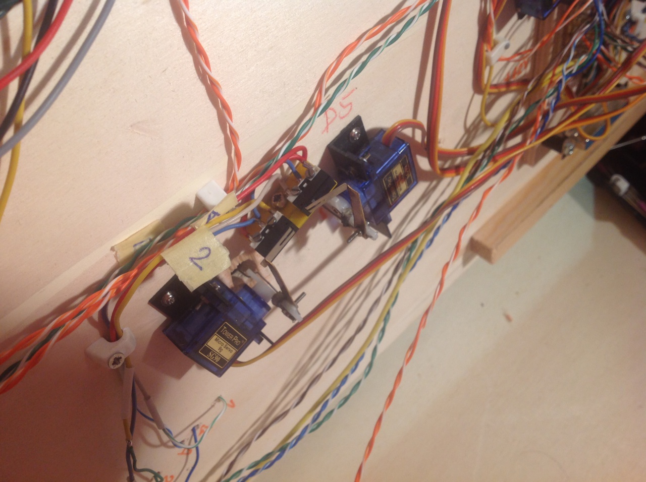 A berakott képen Váltogyárto kolléga 3-s váltojának a polarizácioját végzi a 2 mikrokapcsolo. Ehhez a szervokarra egy-egy lemezt kellett erösiteni, amik a mikrokapcsolokat nyomkodják az egyik állásba.