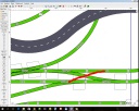 Variáltam az útvonalvezetéssel. Tudom, túl közel van a vágányokhoz, de még majd változtatok ezen. Kicsi a hely, ezért nem tudom, hogy hova tegyem a parkolót. Szerintem, ha a vasút-vasút híd felé helyezem el, és a bevágásban futó vágányt ott még alagútban tartom, akkor megoldható. A vágányok felé pedig valami kis rakodóplaccot terveztem, rakodóépülettel, közúti csatlakozással. |