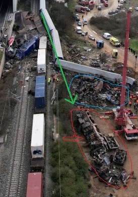 Én is azt nézegettem, de tegnap amikor a daruval emelgettek ott egy roncsot az inkább egy vagonnak nézett ki. Ugy néz ki, hogy a személyvonat elsö kocsija teljesen összetört, ami keresztbe áll a te képeden az inkább a második kocsi lehetett. Az elötte levö roncshalom az elsö vagon, mert azt tették tegnap félre, azon láttam egy darab vagongetöt.