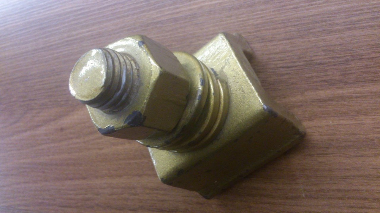 Ez az ún. geo sínleerősítés, melynek részei: geo csavar és anya, geo leszorítólemez, 3-as csavarbiztosító (grower) gyűrű, ezeket látjuk a képen. Ezt a megoldást Európa-szerte alkalmazzák (K típusú sínleerősítésnek hívják egyébként, csak nálunk valamiért a geo nevet adták neki), nálunk is ez az egyik legelterjedtebb. Egyaránt használható talpfás és betonaljas vágányban is, mivel a geo csavart a sín alá kerülő geo alátétlemez bordáján kialakított fészekbe helyezik bele. Különbség abban van, hogy talpfás vágányban (és néhány korai betonalj típus esetén*) 4 db V jelű (15 mm átmérőjű), beonaljas vágányban 2 db KL jelű (24 mm-es) síncsavarral fogatják le a lemezt az aljhoz.