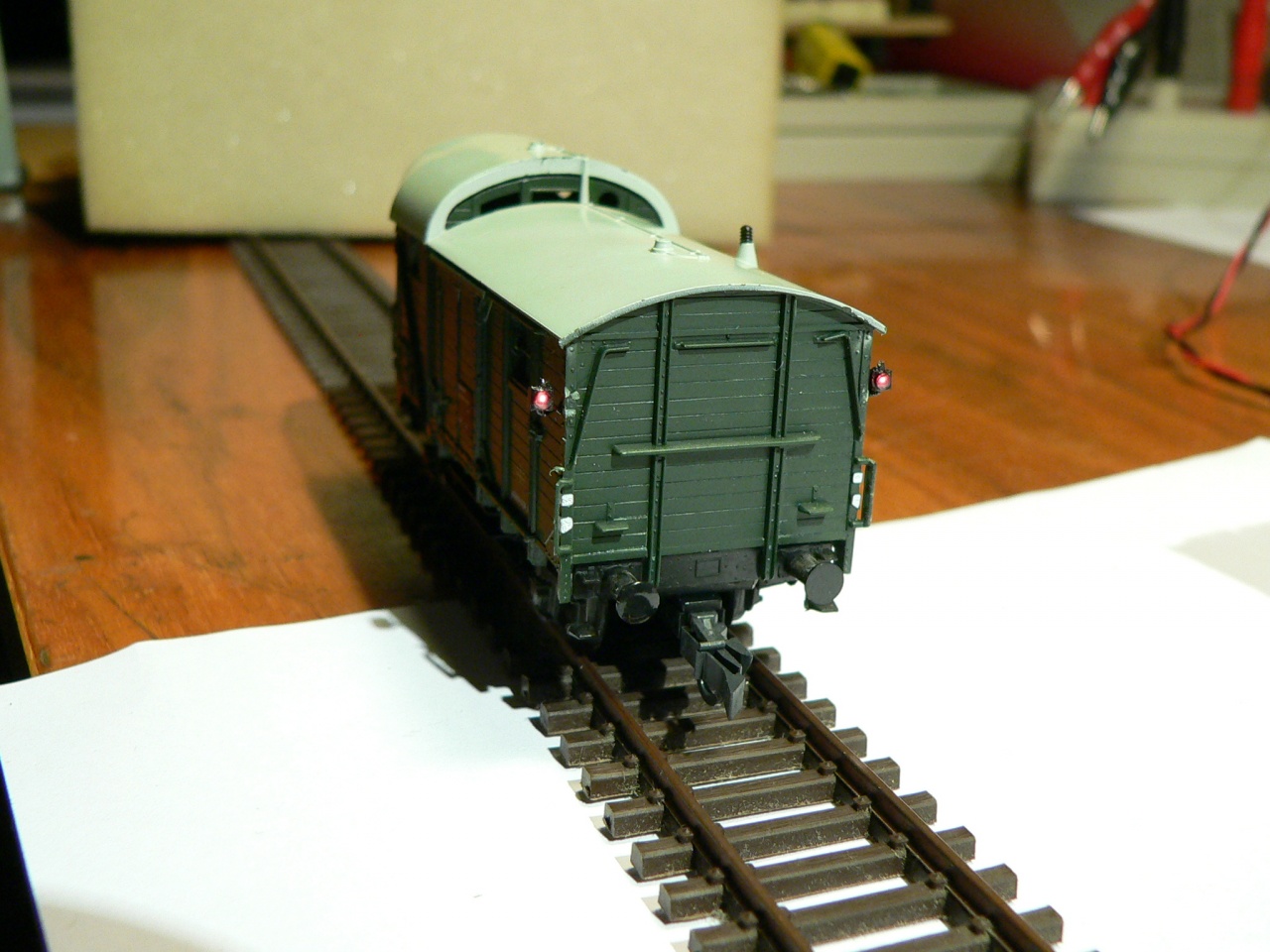 egy régi PIKO kezelő kocsira zárlámpa is került. A kocsi aljára plussz leszedő érintkező, és a kocsi belsejébe az elektronika. Az SMD piros LED-böl könnyü ilyet csinálni.