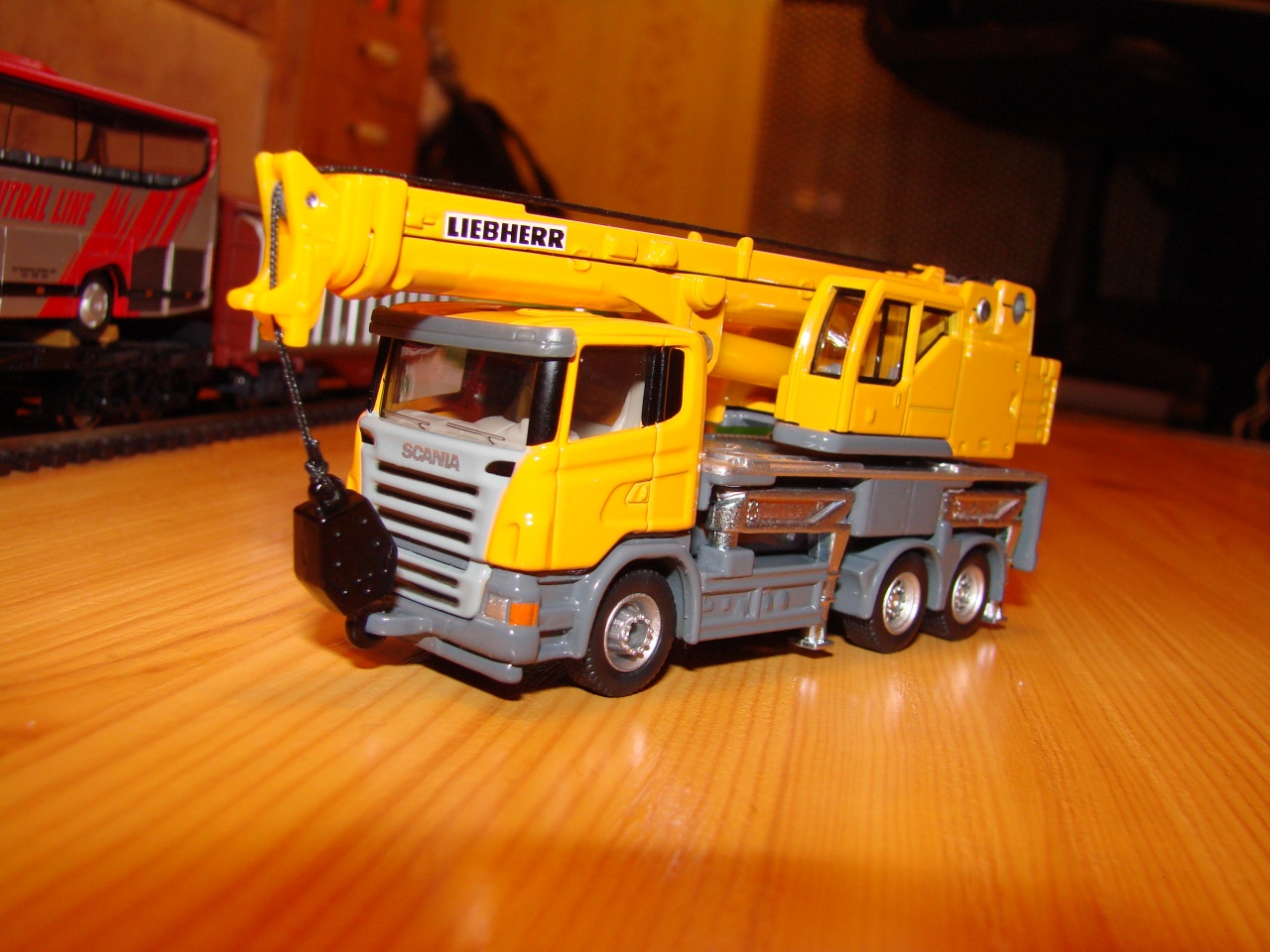 Az eredeti KRC1200 darut a Lipcsei Kirow gyár gyártja, és minden megrendelő kap egy modellt is, egy szép plasztik dobozban. A modellt egy lipcsei kisszériás modellező késziti "resin"-böl. (nem tudom a magyar müanyag név megfelelőjét). Egy modellező barátom Jena-ban, tudott egy modellt szerezni nekem 250,-€ áron. Mivel ez egy kiállitási modell, egy asztali disz, igy egy-két dolgot át kellett alakítanom, friziroznom: kapott fém kerekeket, Roco Kurz kuplungot, fékcsöveket, és ha már egy daru, akkor legyen rajta drótkötél is. Feketére festettem az irányitó fülke ablakait és utána 0,2 irásvetitő fóliából "üveget" is kapott. Mivel az eredetin azért kipufogó stb is van igy ilyen apróságokat is felragasztottam rá. A mellék kocsi, ami a gém alatt van mozgatás alatt egy ROCO 4 tengelyes nehézteher kocsi.