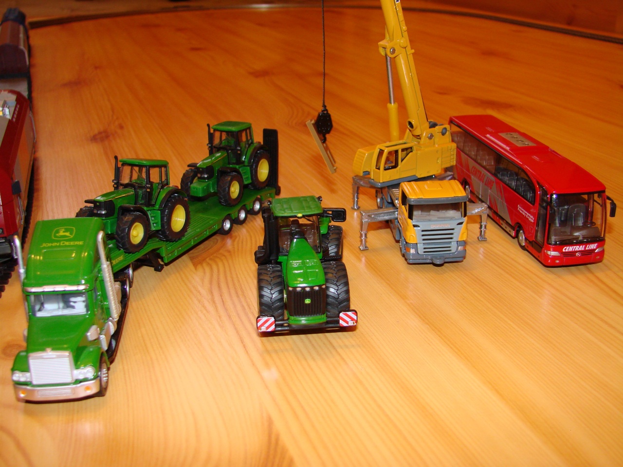 Új szerzeményeink. Az ICE "keverék" a vezérlő kocsi és a mozdony ROCO, a két kocsi FLEISCHMANN. Valamint a pőrekocsi is FLEISCHMANN. A traktorok, és a daru SIKU. A busz REALTOYS. A sok zöldsárga, szakmaimártalom. |