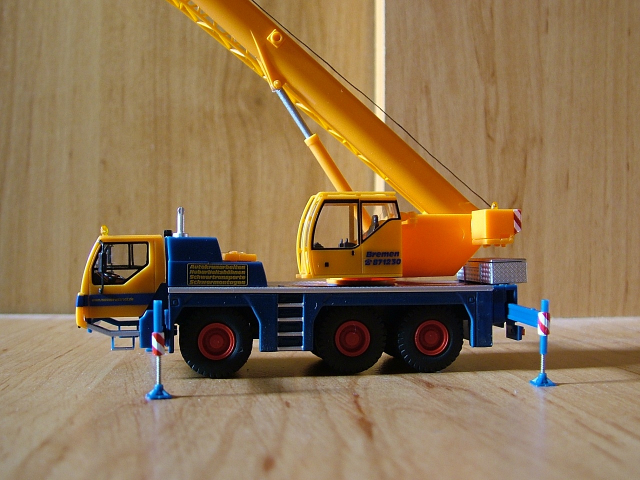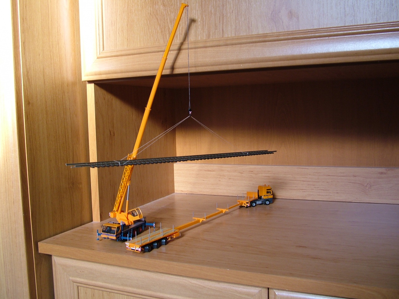A terepasztalon való közlekedésnél, ha vontatják, akkor a gémet alá kell támasztani az igazinál, a modellnél inkább az oldalra való kinyúlást kell megakadályozni. ezt kell még elkészítenem. A gém és az ellensúly kihúzható. Bocsi, hogy csak most válaszolok.  |