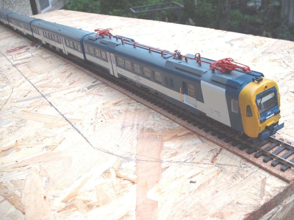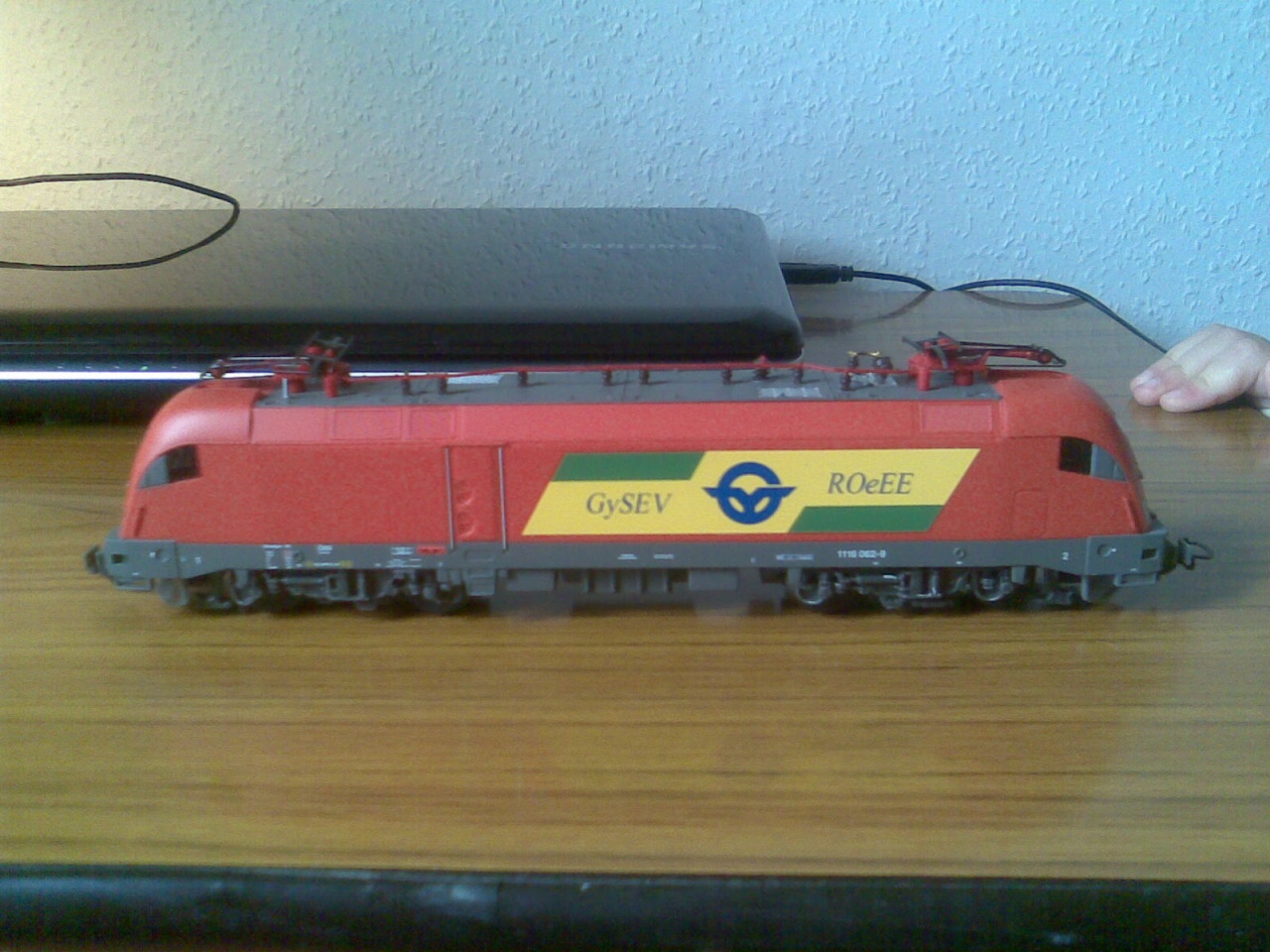 Az eredeti KRC1200 darut a Lipcsei Kirow gyár gyártja, és minden megrendelő kap egy modellt is, egy szép plasztik dobozban. A modellt egy lipcsei kisszériás modellező késziti "resin"-böl. (nem tudom a magyar müanyag név megfelelőjét). Egy modellező barátom Jena-ban, tudott egy modellt szerezni nekem 250,-€ áron. Mivel ez egy kiállitási modell, egy asztali disz, igy egy-két dolgot át kellett alakítanom, friziroznom: kapott fém kerekeket, Roco Kurz kuplungot, fékcsöveket, és ha már egy daru, akkor legyen rajta drótkötél is. Feketére festettem az irányitó fülke ablakait és utána 0,2 irásvetitő fóliából "üveget" is kapott. Mivel az eredetin azért kipufogó stb is van igy ilyen apróságokat is felragasztottam rá. A mellék kocsi, ami a gém alatt van mozgatás alatt egy ROCO 4 tengelyes nehézteher kocsi.