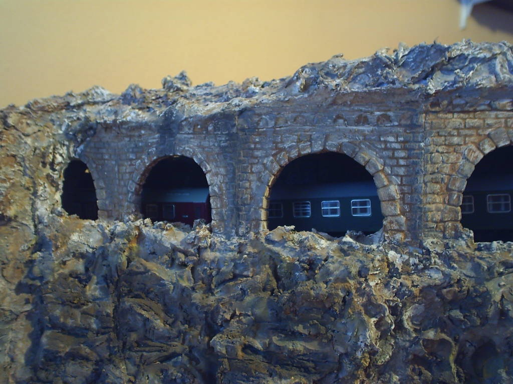 Újra neki fogtam a munkának egy hete. A mellékvonali pálya, egy galériás alagúton keresztül bukkan a felszínre. Már volt egy próbálkozásom, de az nagyon nem jól sikerült. Egy kis trotilt tettem alá  és újra építettem. Még várom hogy száradjon a festés aztán már csak kontúrozás, meg a fűszórás marad hátra.