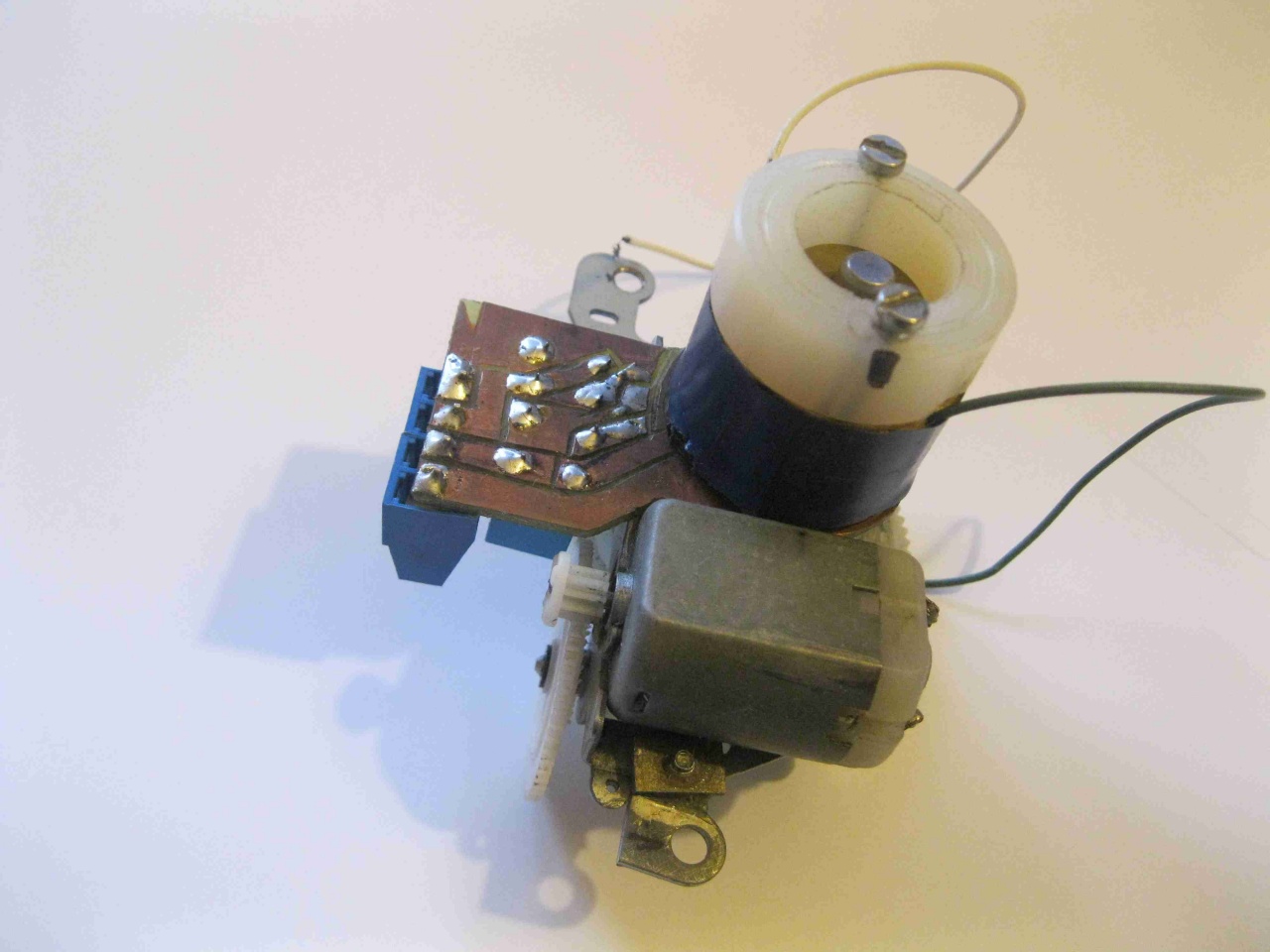 Nálam a mechanikai kialakítás a mellékelt képeken látható, videomagnó részből csinálta Gábor. Szerintem teljesen precíz. Következő feladataim koronghoz való hozzáerősítés, valamint a mágnes megfelelő elhelyezése lesz. Ez a pontosság miatt nem egyszerű.