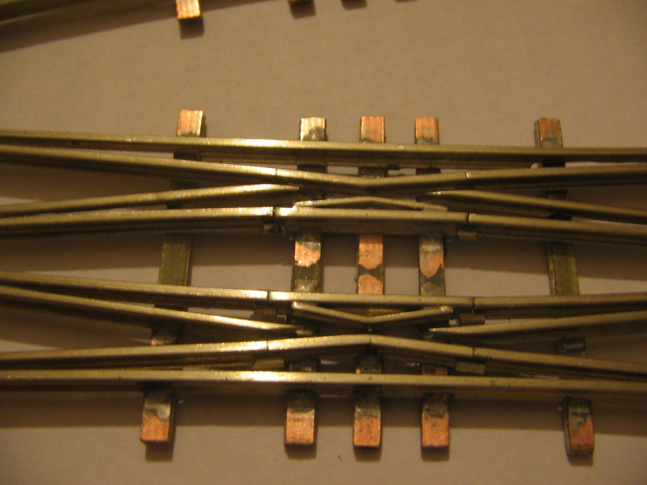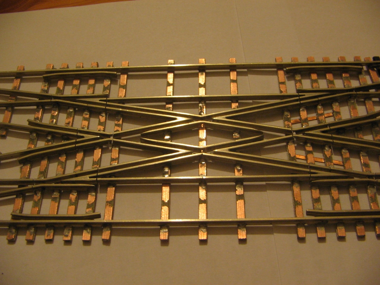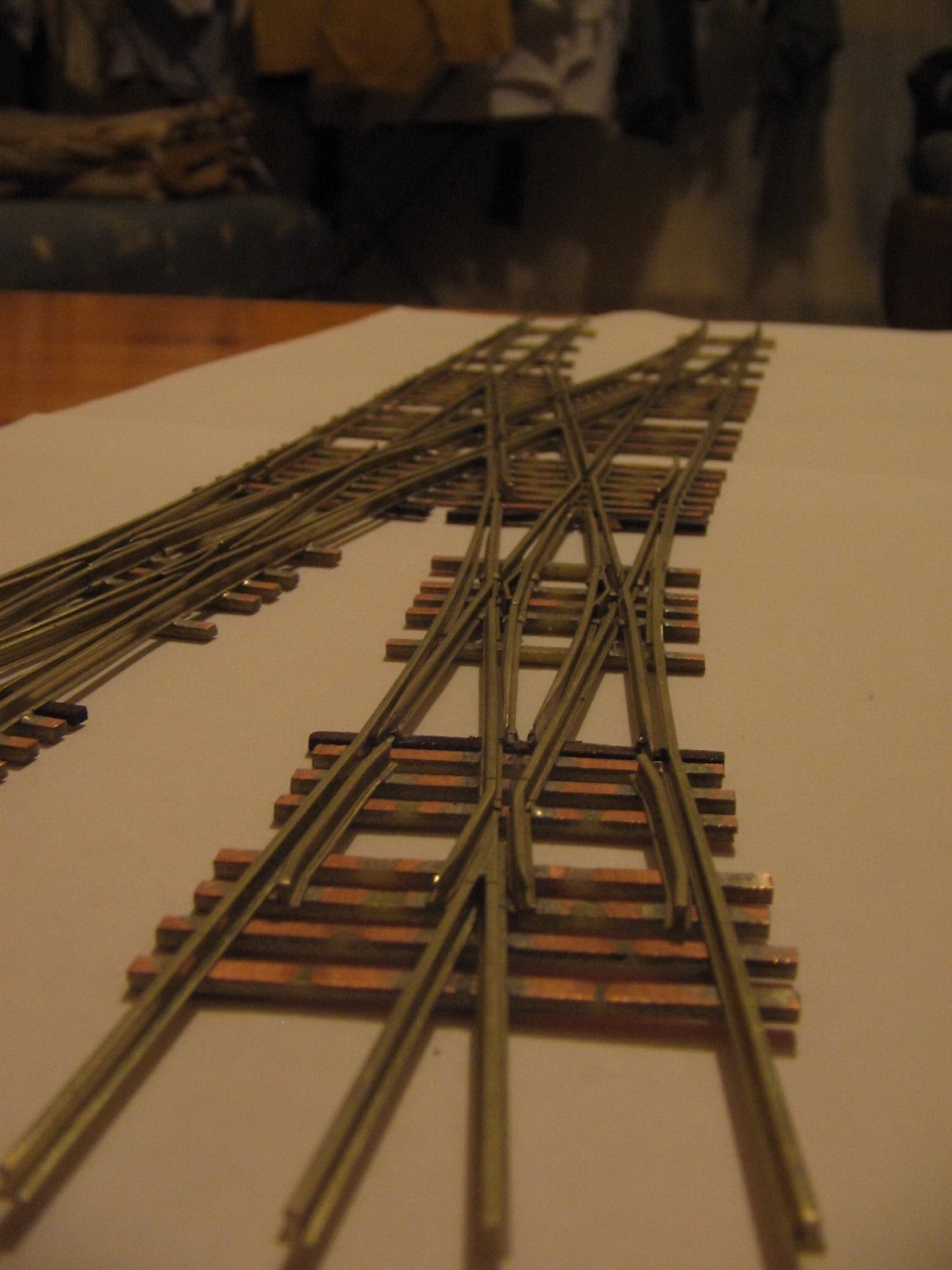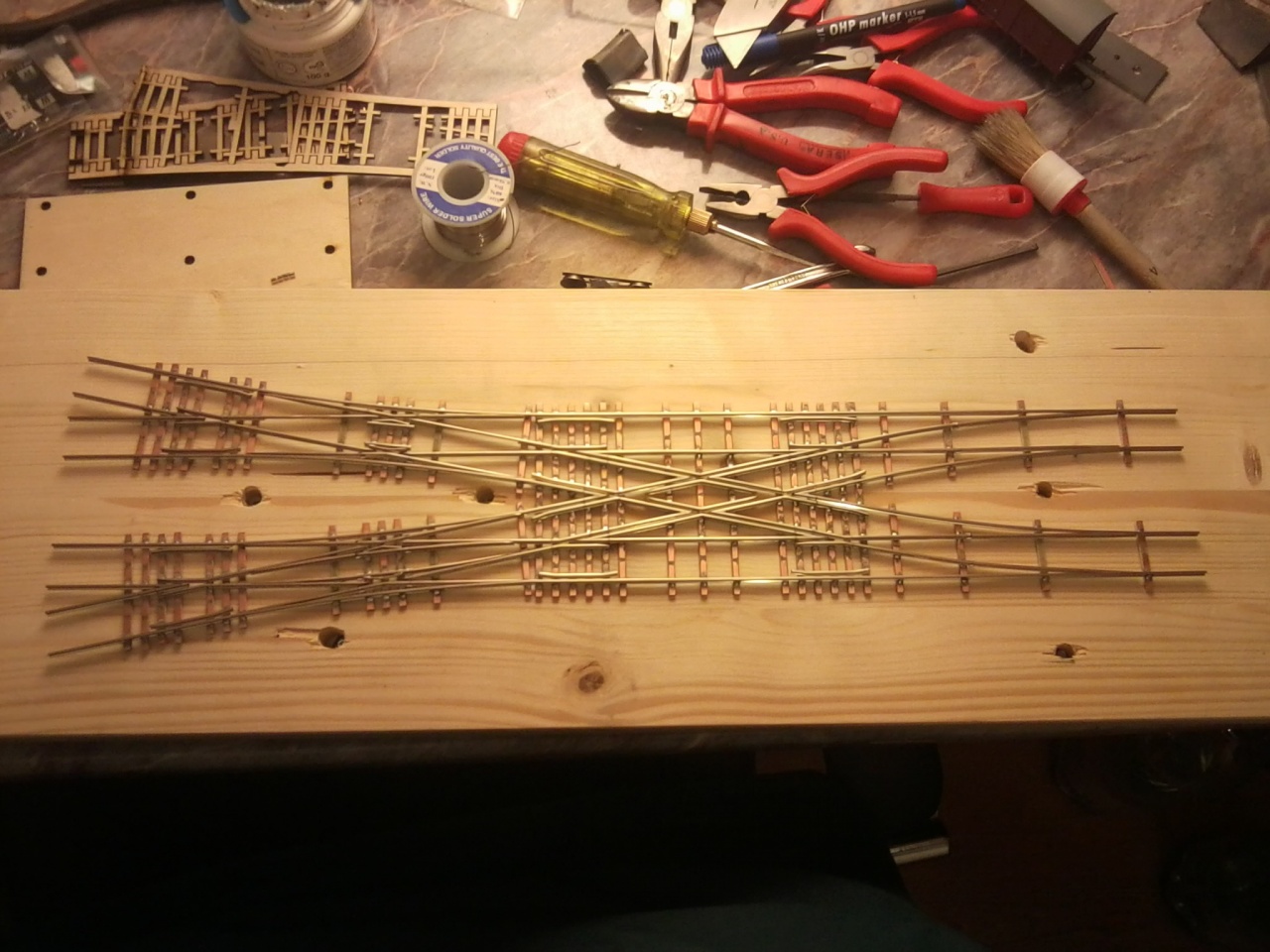 Az elmúlt egy hétben nem sokat tudtam hozzátenni a két angolos hózentrógerhez, így csak ma barkácsoltam rajta. Örültem, hogy végre befejeztem a vágányzatot, akkor vettem észre, hogy az egyik angol belső csúcssínei lemaradtak! BakkeR!!! Viszont megoldást találtam a belső keresztezéseknél lévő vezetősínekre. Ide CODE 100 profil esetén nem fér be rendesen egy saját profilból készített vezetősín, mint a Tillig profil esetén, így megpróbáltam CODE 80-as profilból, ami vasasgabri N-es váltóiból maradt, és igen tetszetős, és főleg jól működő végeredményt kaptam!