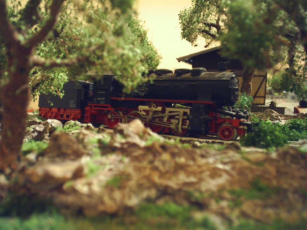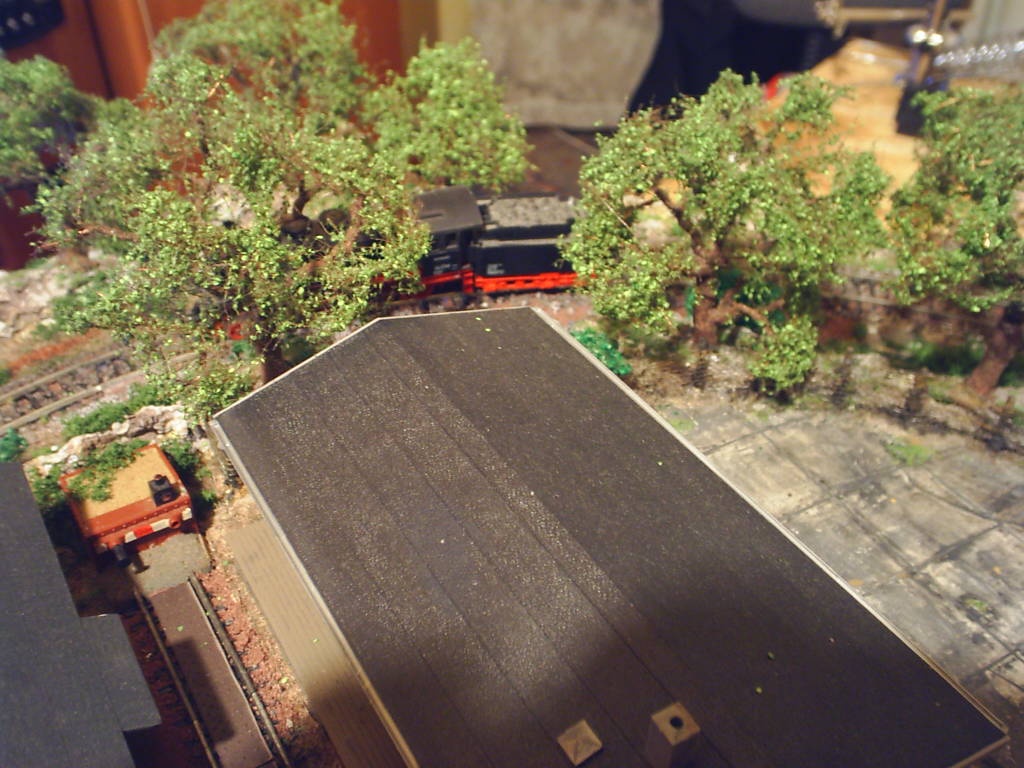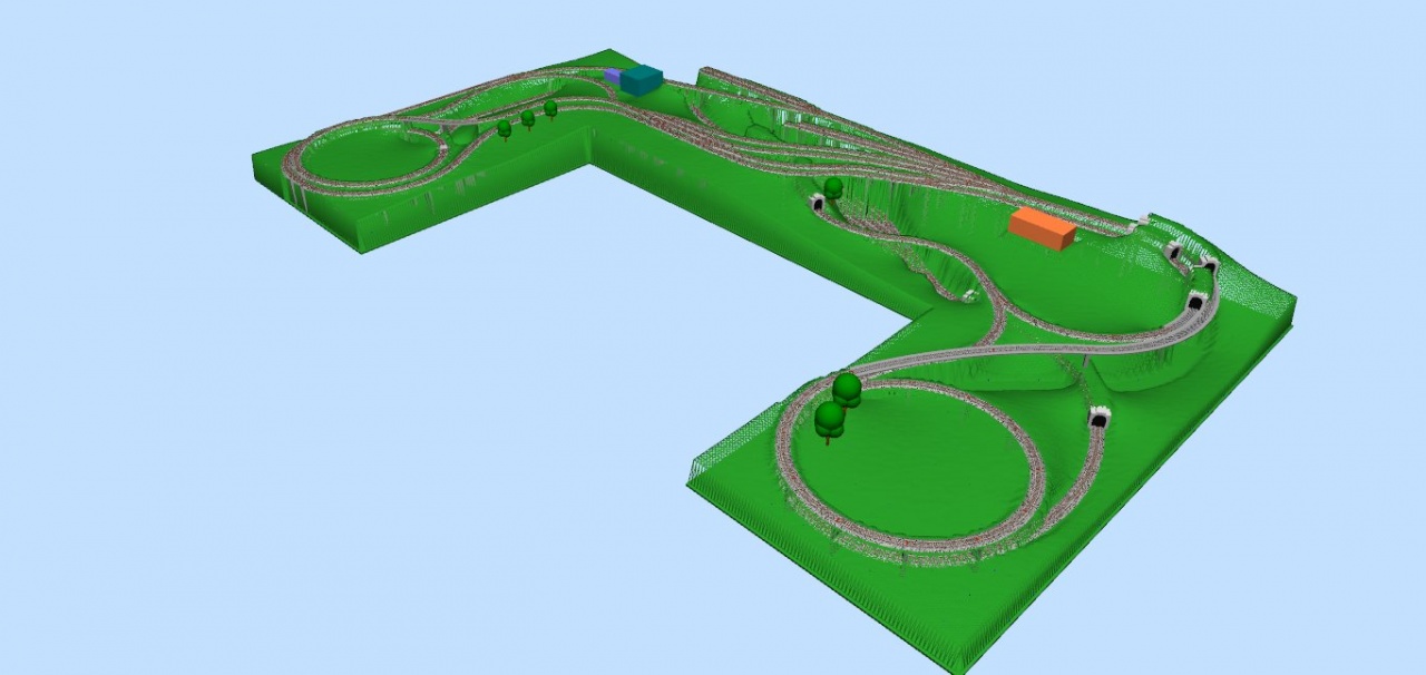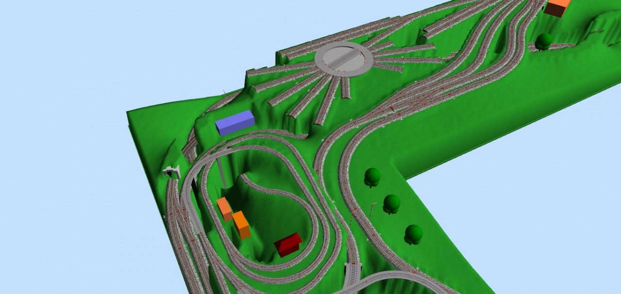 A fordító korong alatti domboldal a jelen képen látszólag minden vágány alatt "szakadékkal" elválik a szomszédos vágánytól. Ez így nagyon nem realista kinézetű! (Egyébként az egész fordítókorong eléggé "fura" helyen van...) |