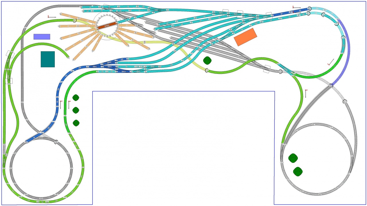 Több helyen is adja a 2 vágány illuzioját, de az egész vonalvezetés csak egyvágányú, igy nagyságrenddel többet lehet kihozni az adott térböl - és érdekesebb vonalvezetést ad.