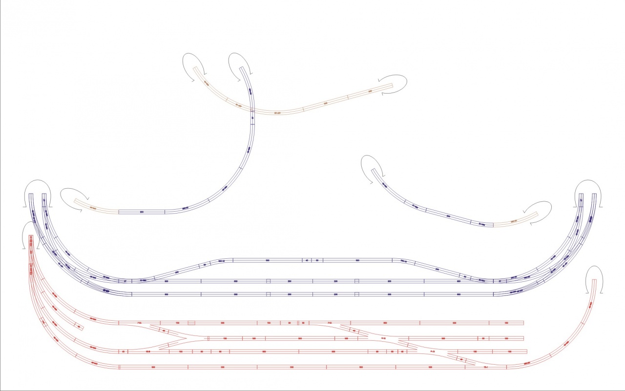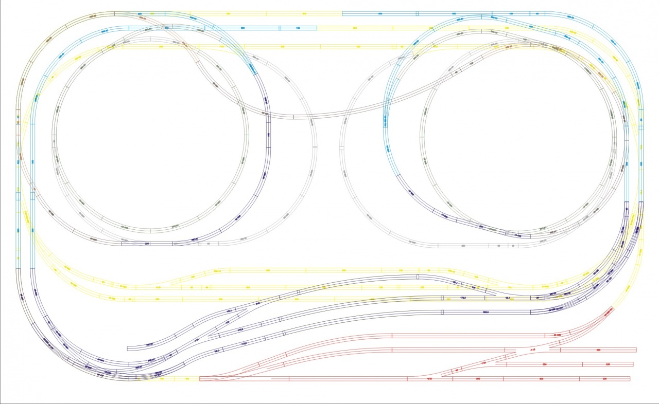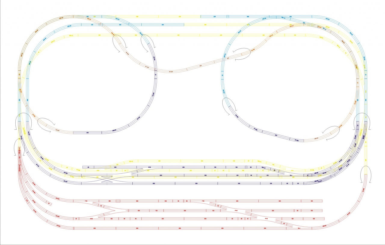 Elkezdtem tervezgetni az asztalomat. Ez egy H0 2600x1600mm alapterületű lap lesz, három szinttel. Noha a vonalvezetés elég sűrű, azért az asztal nem lesz zsúfolt, mert elég nagy része rejtve lesz. Az egész tk. egy hosszú kör, de több helyen le lehet rövidíteni, és van egy három vágányos tároló is az alsó szinten. |