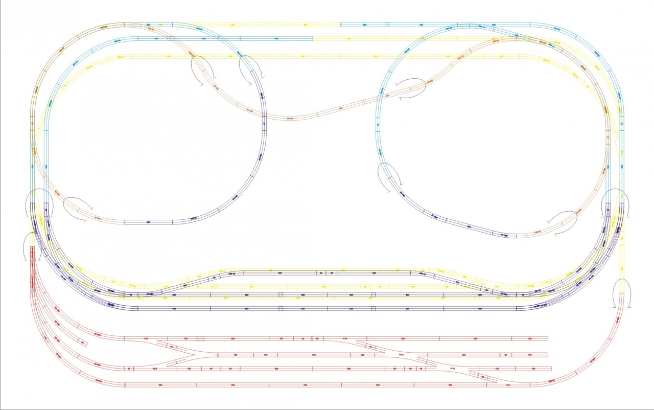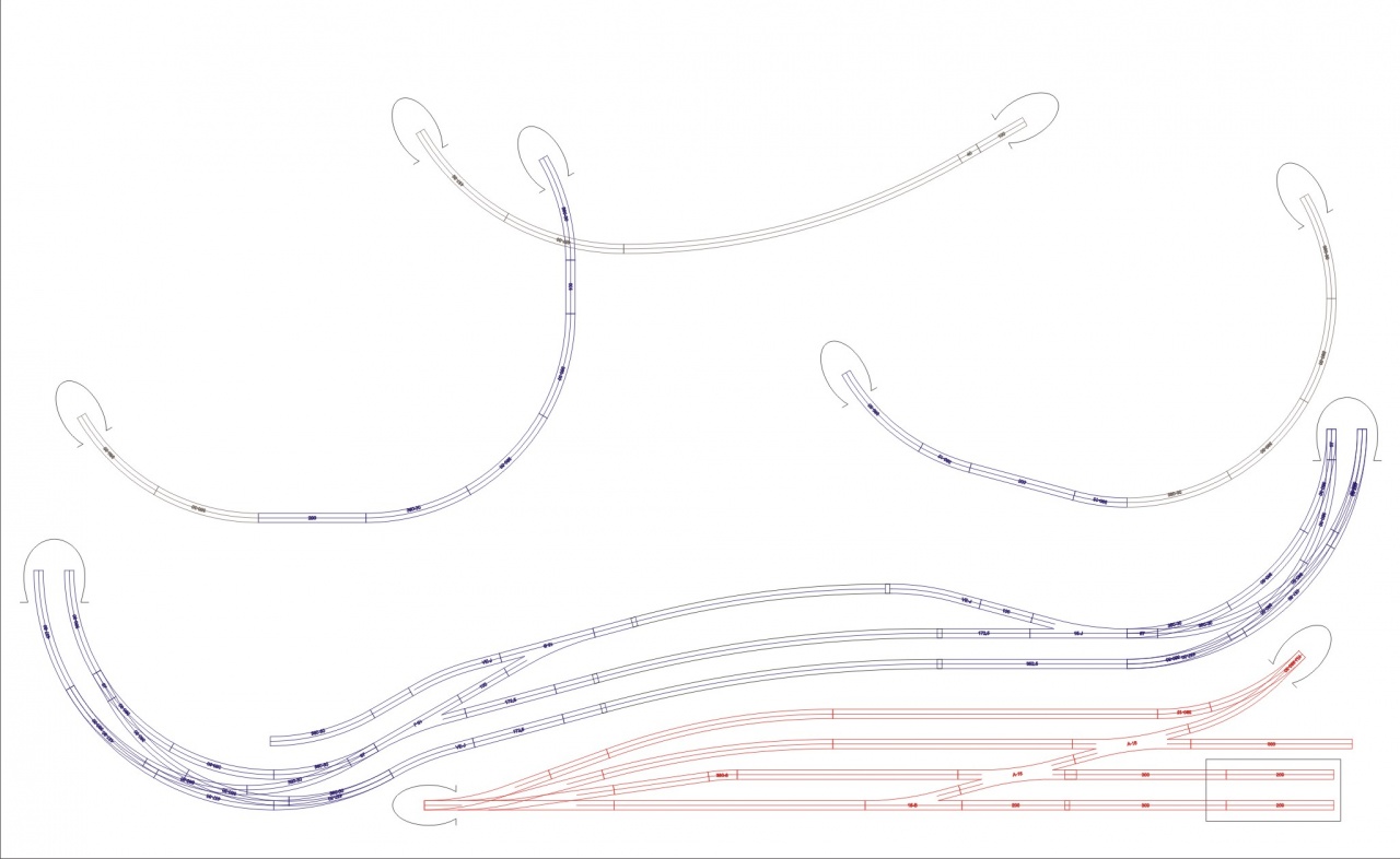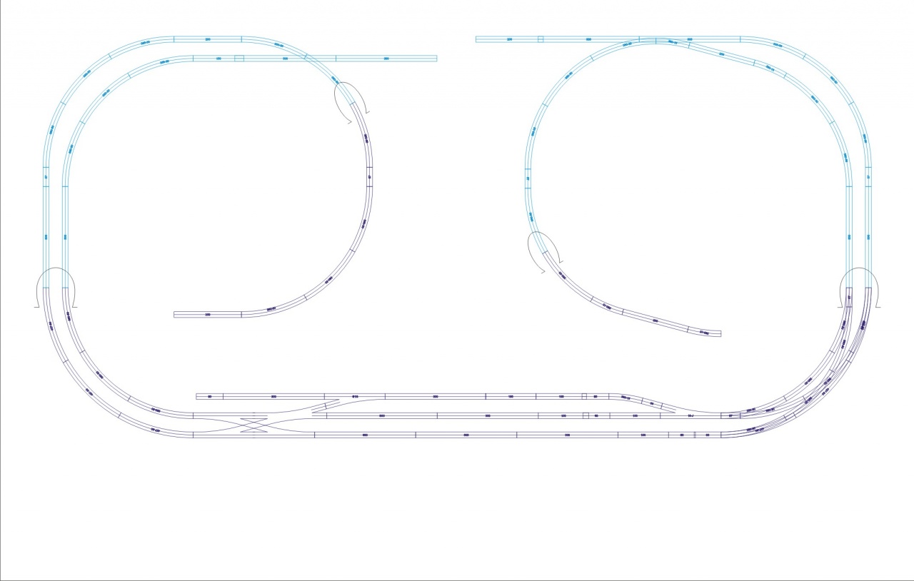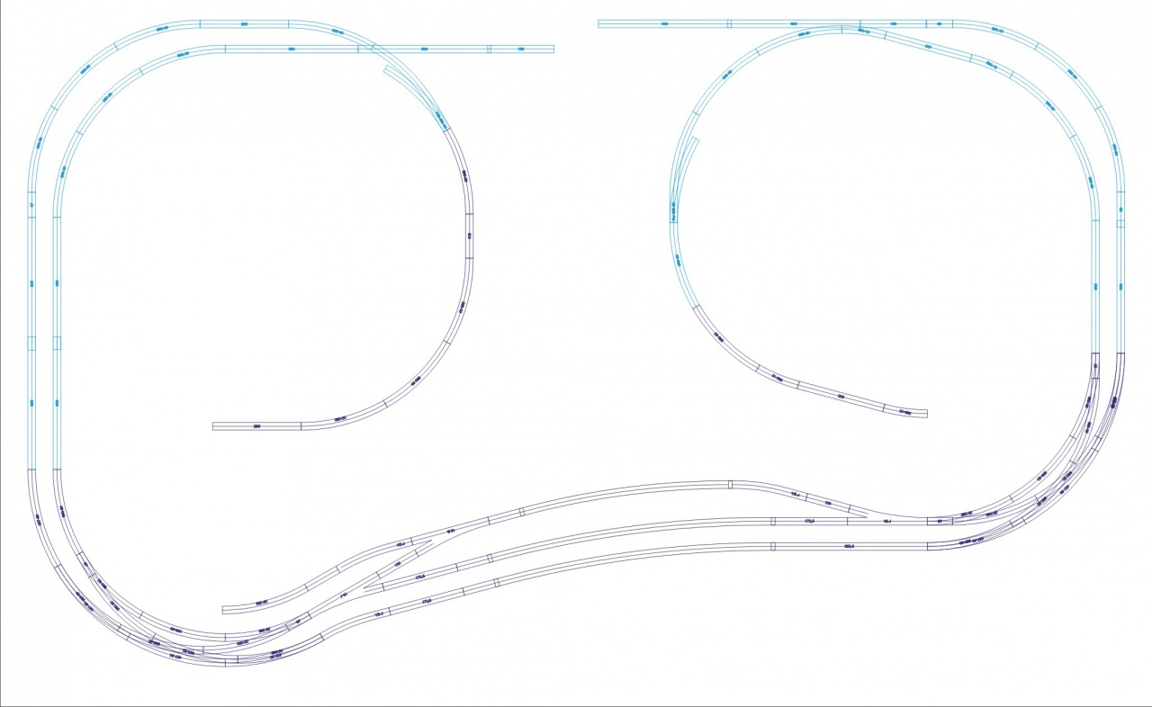 Elkezdtem tervezgetni az asztalomat. Ez egy H0 2600x1600mm alapterületű lap lesz, három szinttel. Noha a vonalvezetés elég sűrű, azért az asztal nem lesz zsúfolt, mert elég nagy része rejtve lesz. Az egész tk. egy hosszú kör, de több helyen le lehet rövidíteni, és van egy három vágányos tároló is az alsó szinten. |