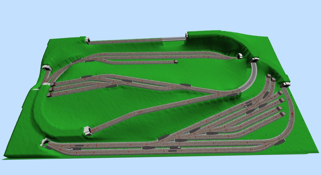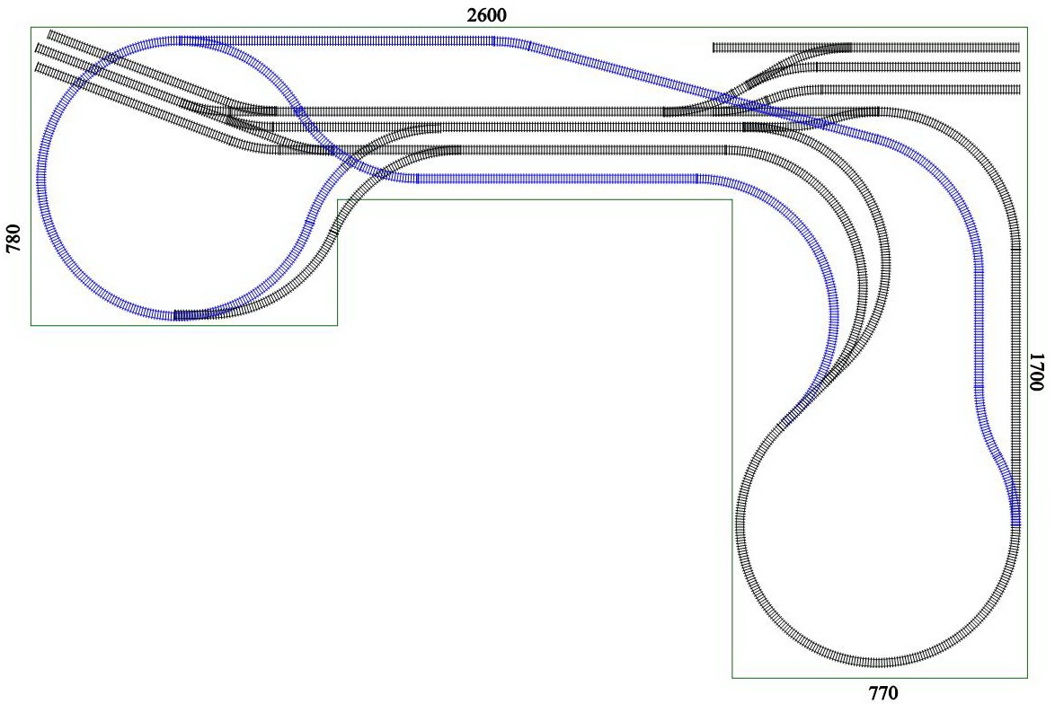 Sziasztok! Segítséget szeretnék kérni: terveztem egy terepasztalt, a csatolt képen láthatjátok. ami a rajzot illeti: az asztal méretei mm-ben vannak megadva a fekete sínek a felső szint, a kék az alsó szint. Igyekeztem úgy tervezni, hogy a vonatok mindkét irányba vissza tudjonak fordulni, így dupla hurok van a vágányzaton. a jobb felső sarokban lenne a fűtőház és a hozzá tartozó dolgok, a bal felső sarokban pedig tároló, rendező, átrakó vágányok. Ami a fizikai kivitelezést illeti: minden ív, a váltók is 360mm-es sugarúak. az állomáson max. 1m hosszú szerelvény fér el. Ha bárkinek bármilyen véleménye van, hogy hova tegyek még váltót, vagy vegyek ki, esetleg hogy módosítsam a pályatervet, hogy izgalmasabb legyen, vagy ha valami nem jó, nyugodtan szóljon, előre is köszönöm szépen! |