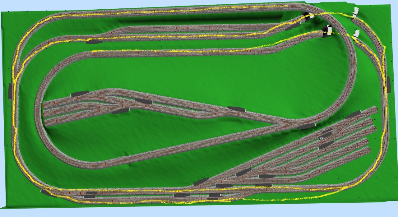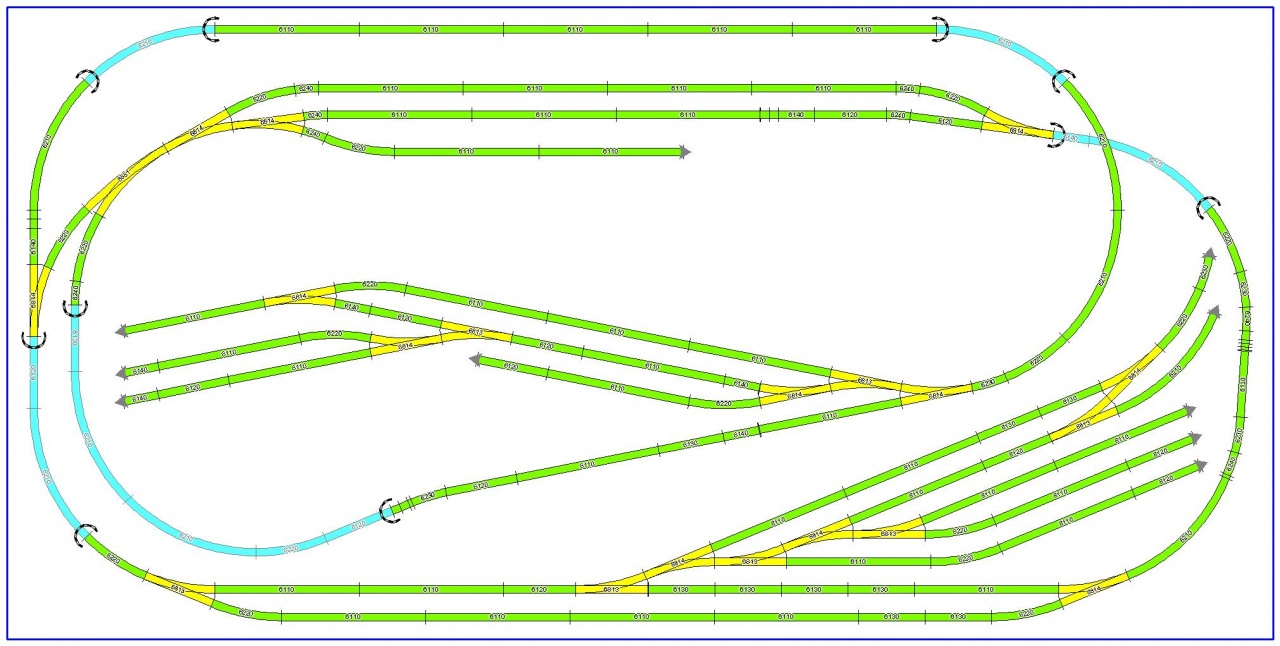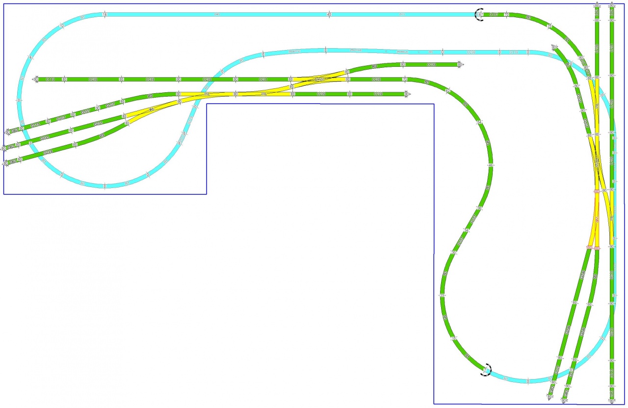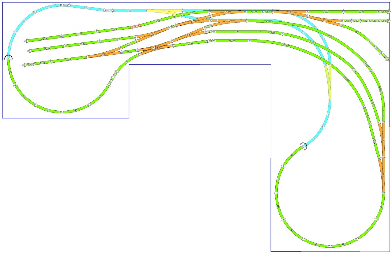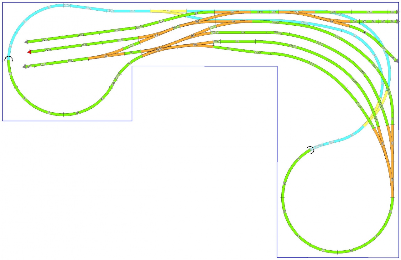 Sziasztok! Véleményeket, és kritikákat szeretnék kérni erre a tervre. Egy 2x1m-es asztalom van, BTTB sínekből építkezek. A sárgával jelölt részek már le vannak fektetve, a többi még csak terv. Sajnos nagyobb asztalt semmiképp nem tudok csinálni, ezen belül kell mozognom. Az ötleteket és a segítséget előre is köszönöm!  |
