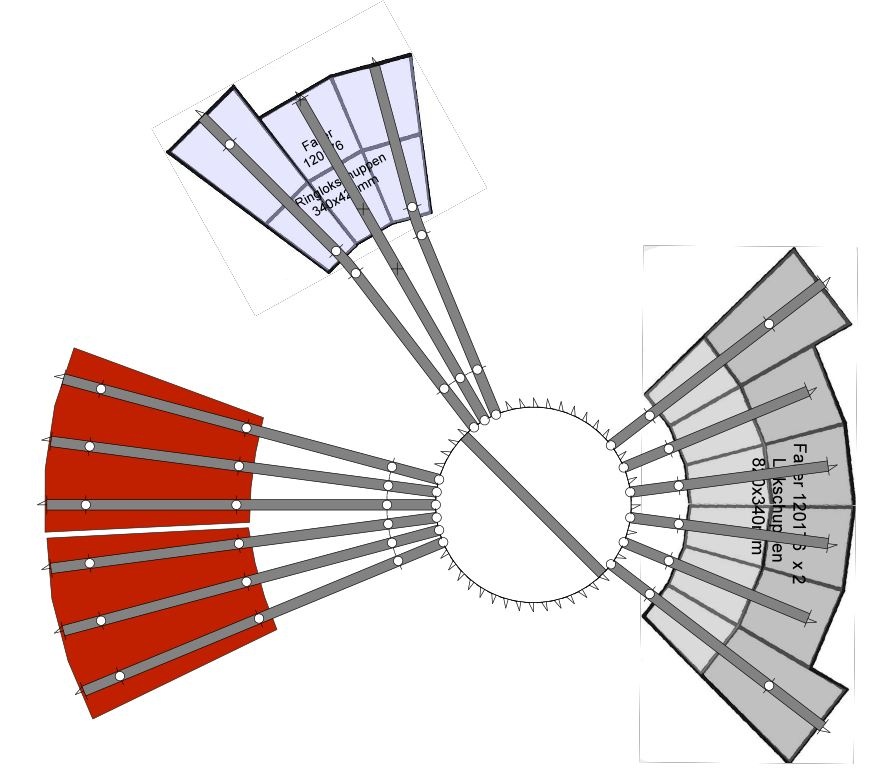 -középen: 15fokos ház, 7.5 fokos kijárattal. Ház ajtajánál a két szélső vágány kikanyarodik fejenként megint 7.5 fokot. Így a korong és ház közé elfér egy mozdony, de nem lehet körívben folytatni, megmarad 3 állásosnak.