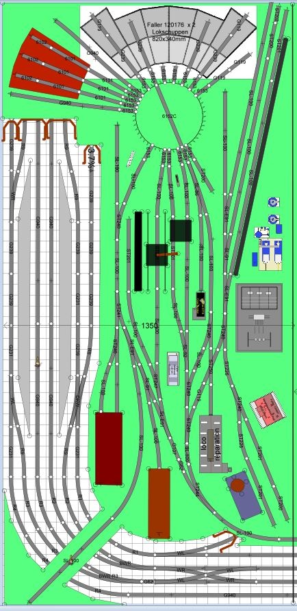 Csakhogy vannak olyan elemek, gyári állomások peronja, szenelő, salakozó, stb., amik megkövetelnek egy bizonyos vágánytengely távolságot, helyet, vagy éppen fix érték kell neki. A fent csatolt vontatási telepről lefelejtettem a salakozót, ami már megvan nekem, ezért tervezhetem újra az egészet, mert az eltérő követelmények miatt nem egyszerű a beillesztése. Az ilyen anomáliák elkerülése végett, mostanában már fix termékekhez igazítva készítem a tervet is.