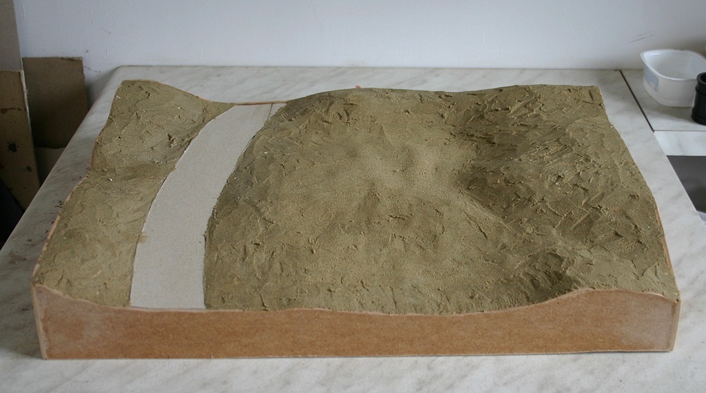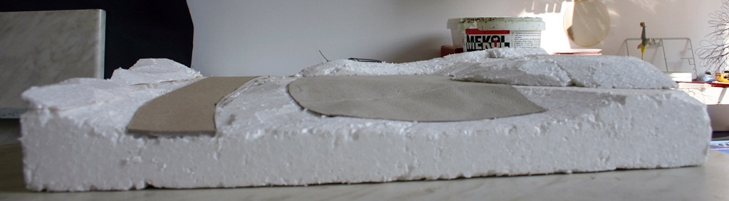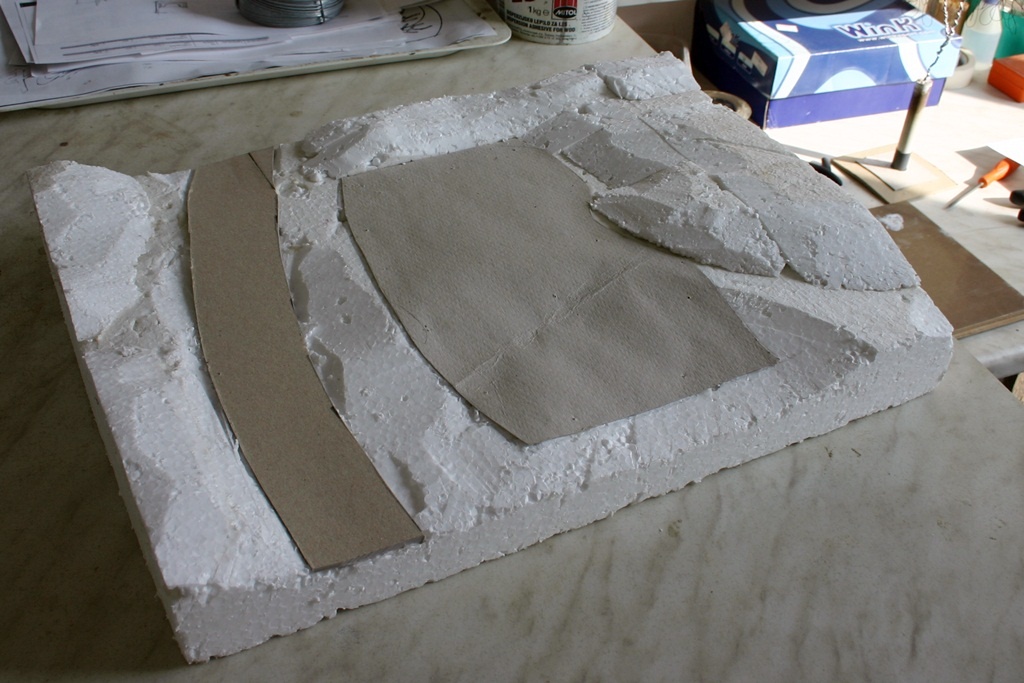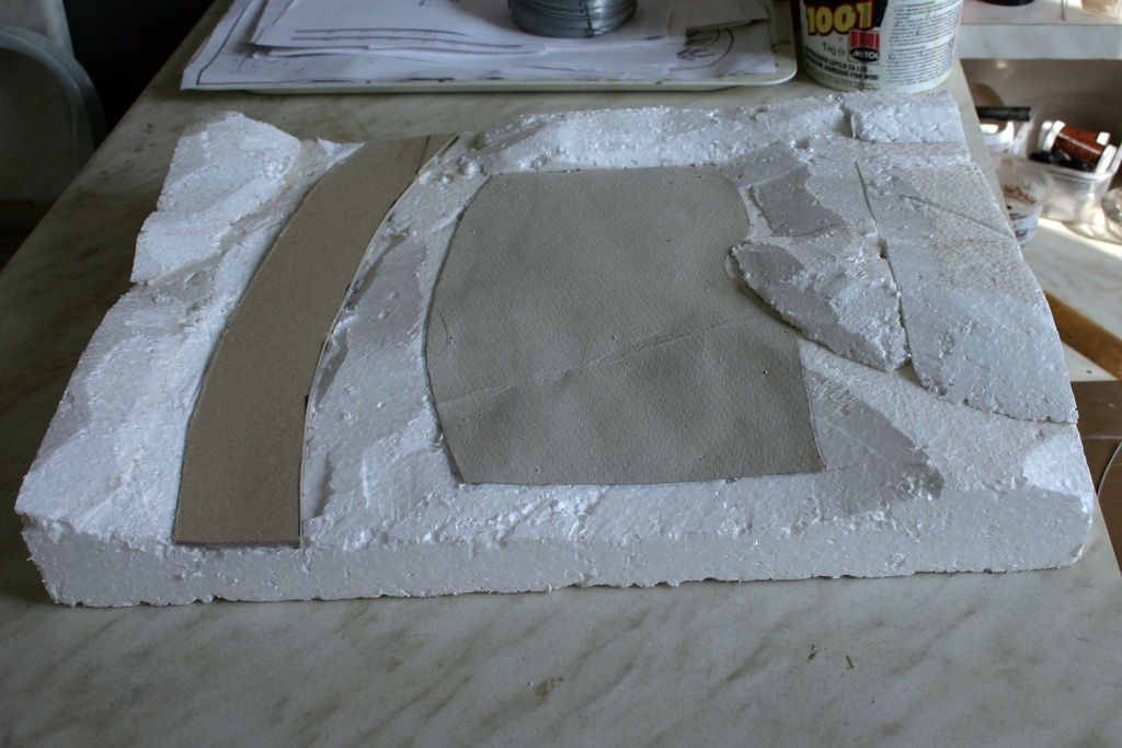 Amint a képeken nagyjából követhető, az alapja Nikecell. Ezt bevontam egy homokból, faragasztóból és vízből álló masszával, egyrészt hogy a nagyobb egyenetlenségeket kiegyenlítsem, másrészt pedig hogy alapot adjon a következő rétegeknek.