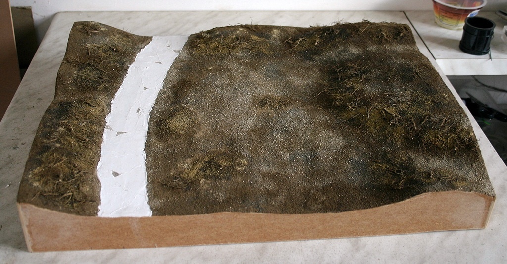 Az út alapja vastag 2,5 mm-es karton. Erre felkentem fatapaszt, bele karcoltam a repedéseket és kikapartam a kátyúkat. S kátyúkba kentem egy kis faragasztót és szórtam bele homokot. A festést Gunze Panzergrau (ez volt itthon  ) és egy vlágosabb szürke (az is valamilyen német páncélos szín